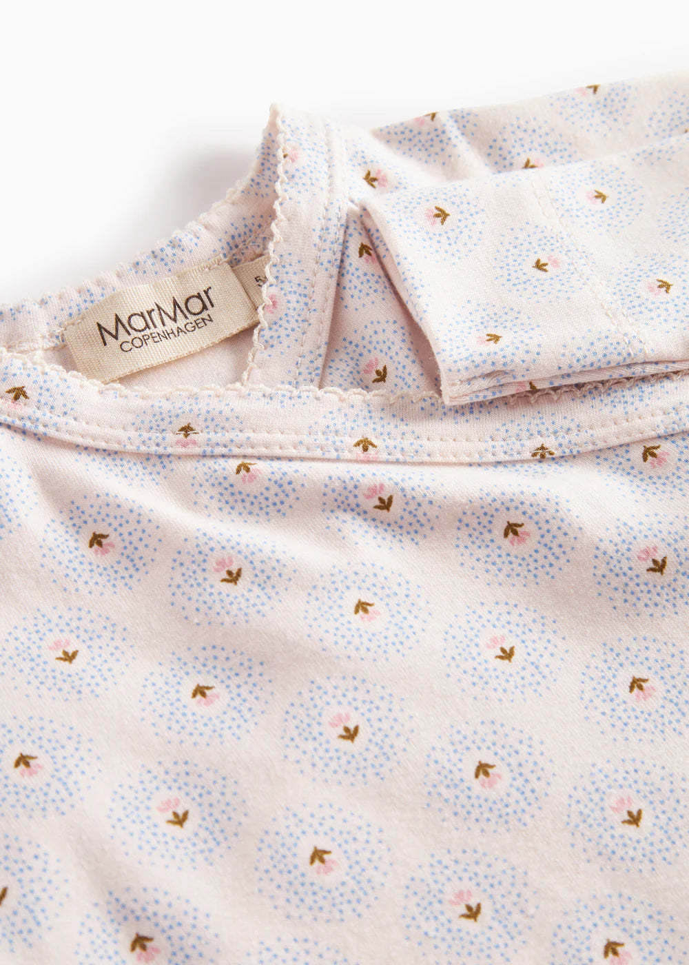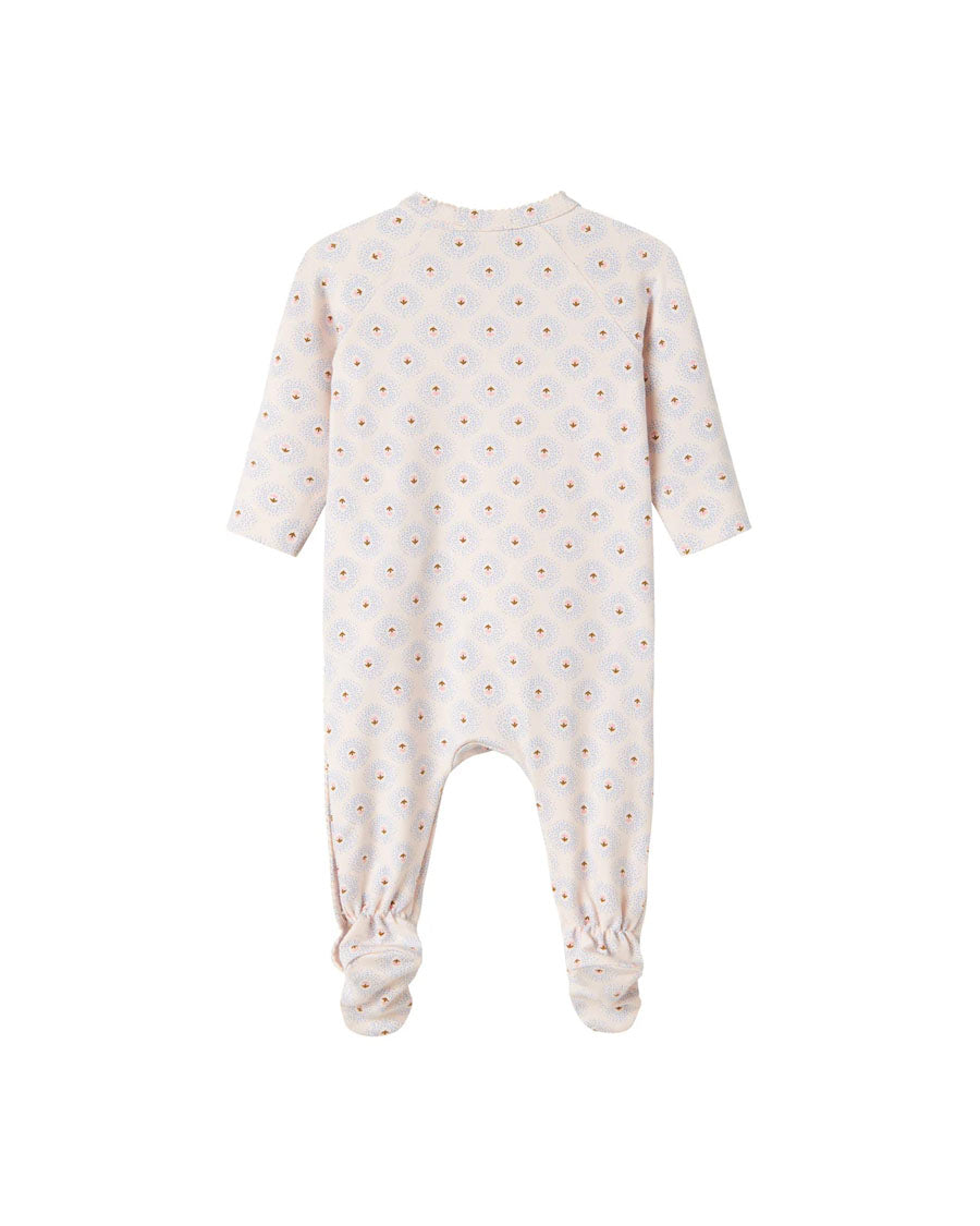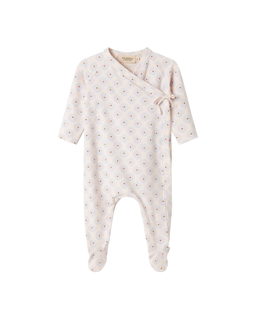 Long-sleeved jumpsuit with feet for newborns. The jumpsuit has a wrap-around closure and closes with snaps and ties from the neck down one leg. The jumpsuit has a nice print and is both soft, stretchy and comfortable to wear.