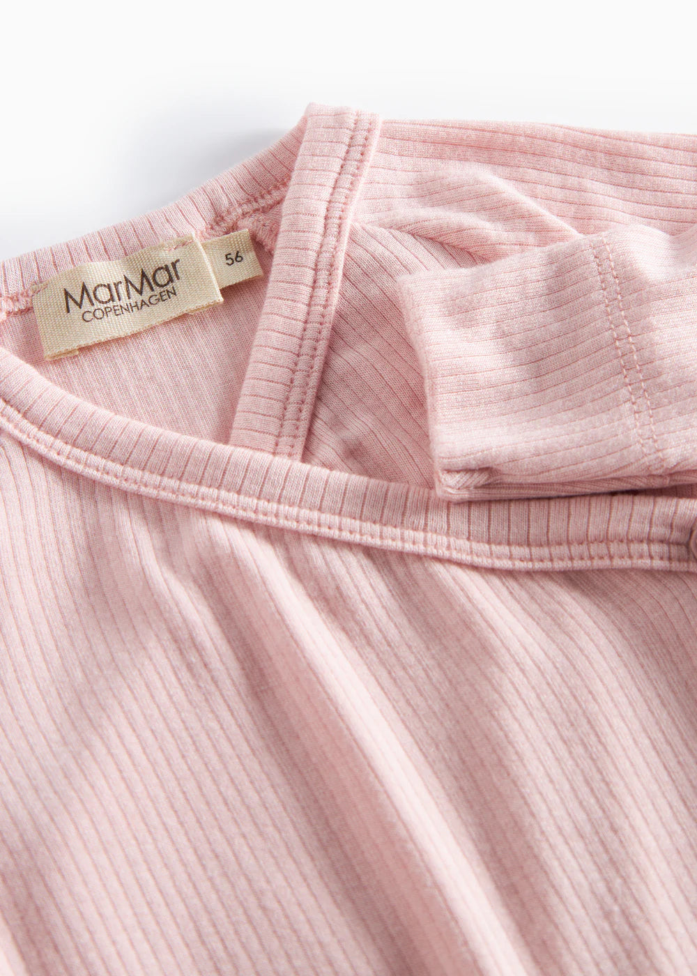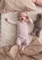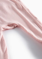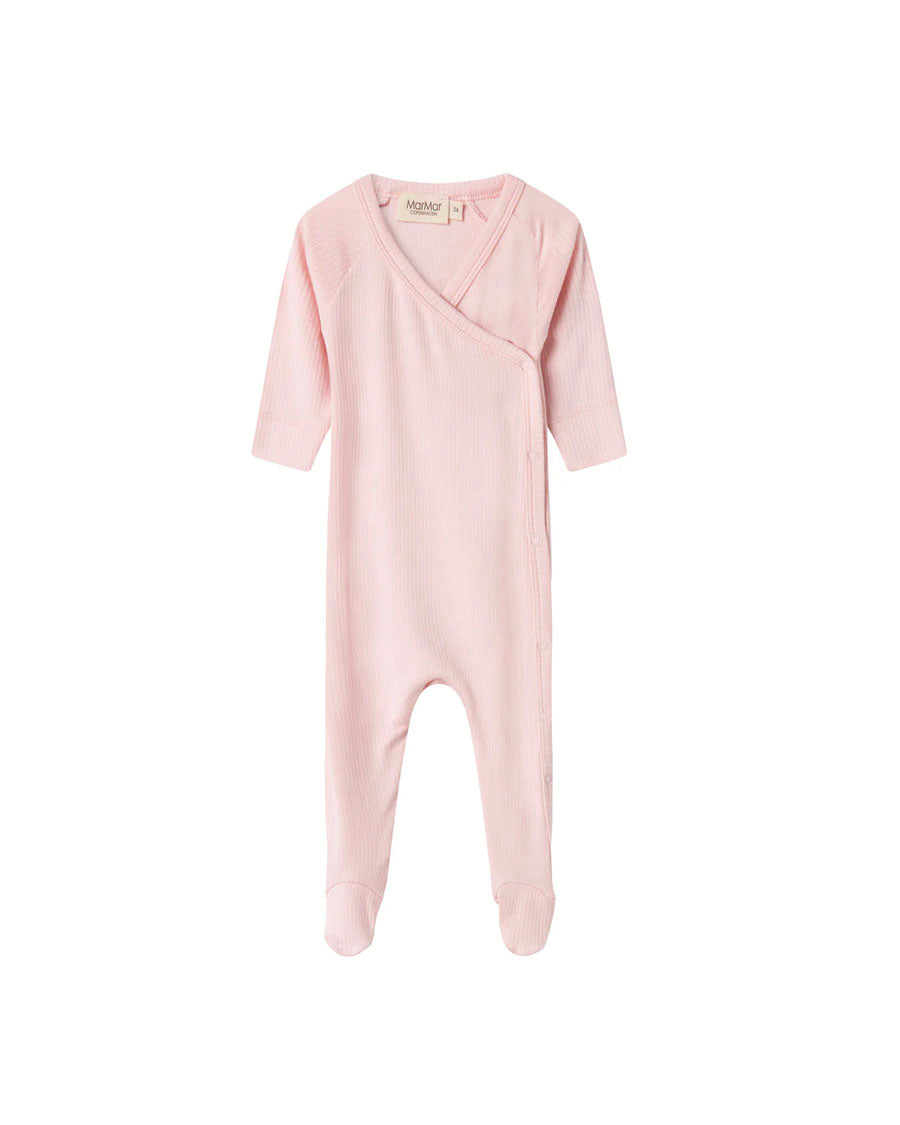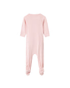 Long-sleeved jumpsuit with feet for newborns. The jumpsuit has a wrap-around closure and closes with snaps from the neck and down one leg. The jumpsuit is incredibly soft, very stretchy and comfortable to wear.