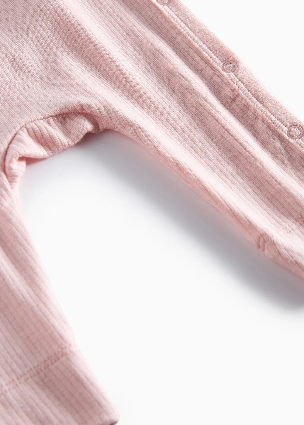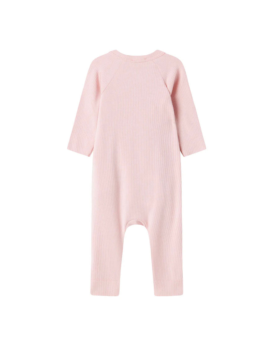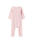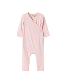 Long-sleeved jumpsuit with wrap-around closure for newborns. The jumpsuit closes with snaps from the neck and down one leg. The jumpsuit is incredibly soft, very stretchy and comfortable to wear.