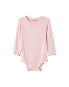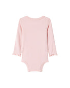 Simple long-sleeved bodystocking with ruffled sleeves that close with snaps on the left shoulder and between the legs for easy diaper changes. The bodystocking is incredibly soft, very stretchy and comfortable to wear.