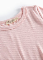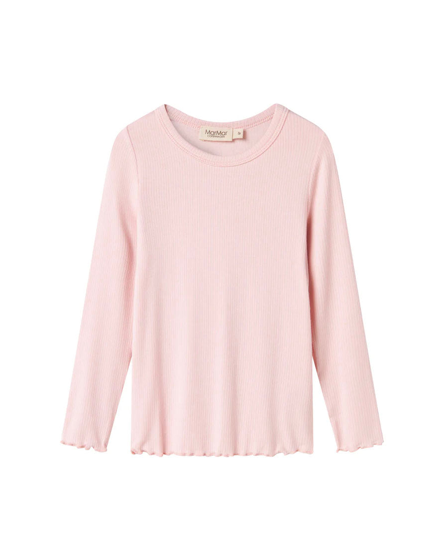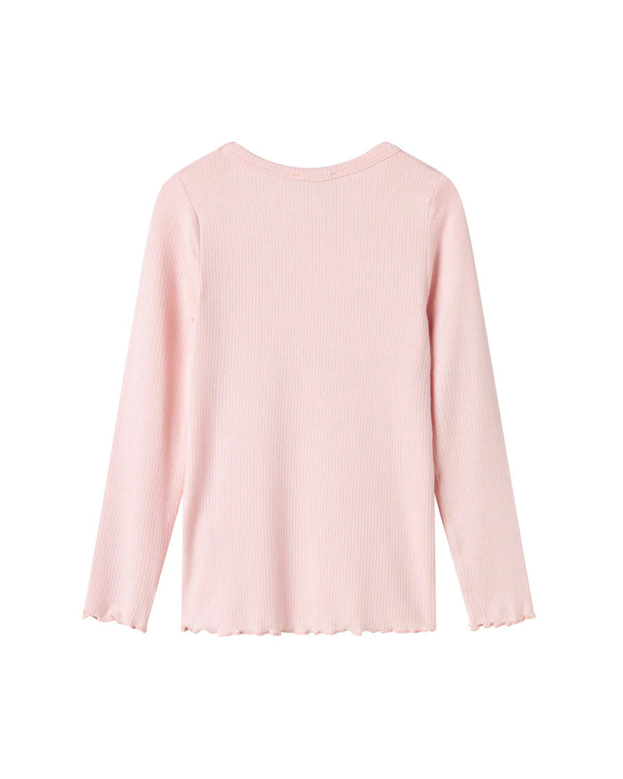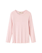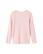 Simple long-sleeved t-shirt with ruffled edges on the sleeves for children. The t-shirt is soft, stretchy and comfortable to wear.
