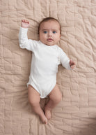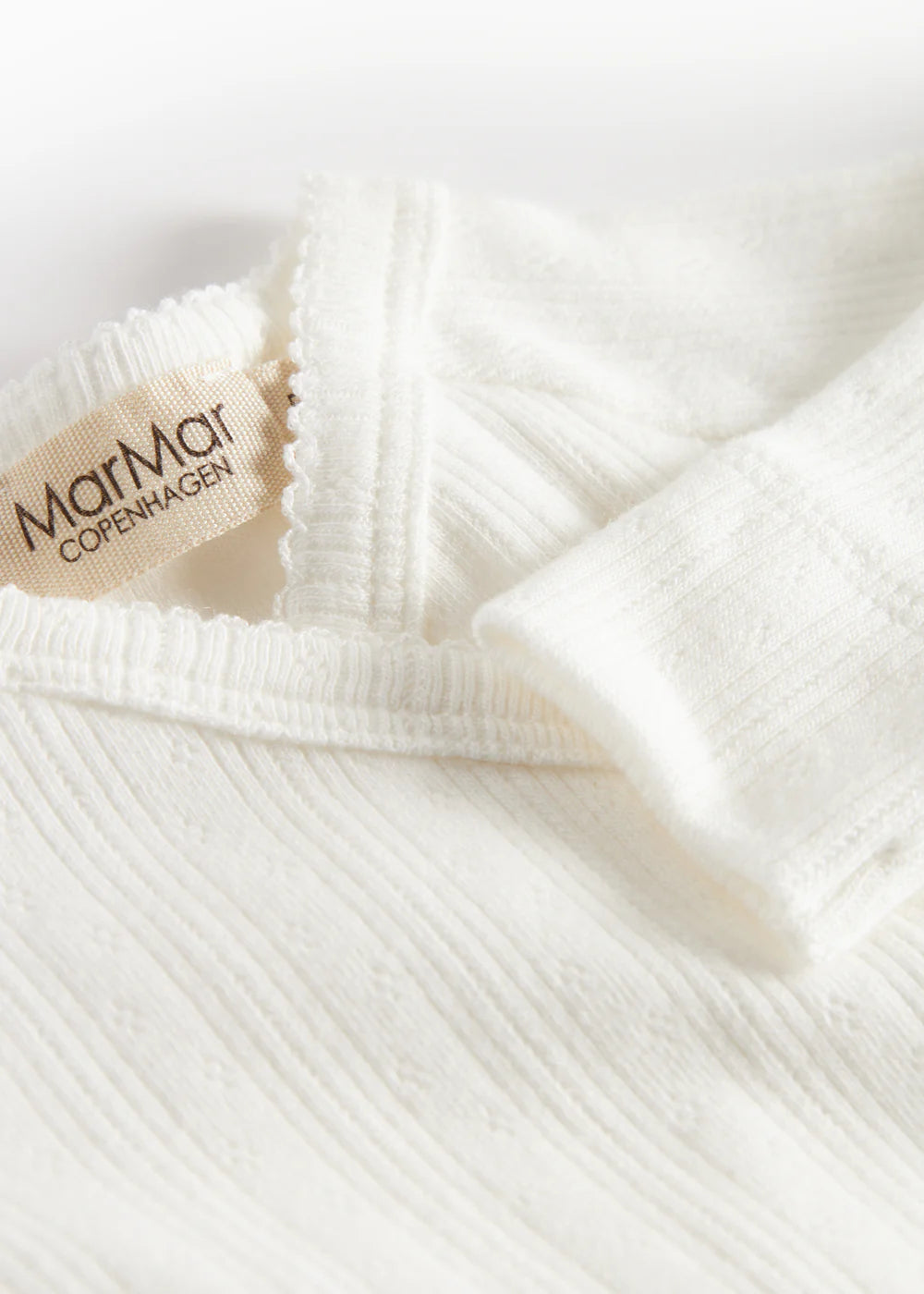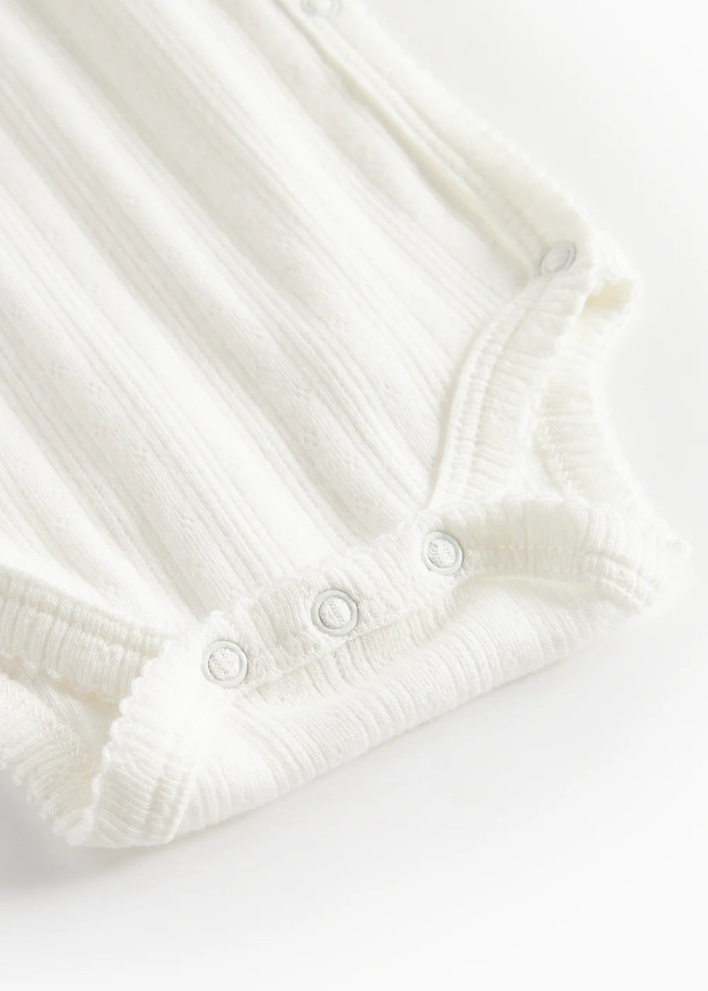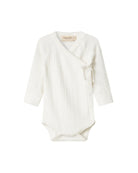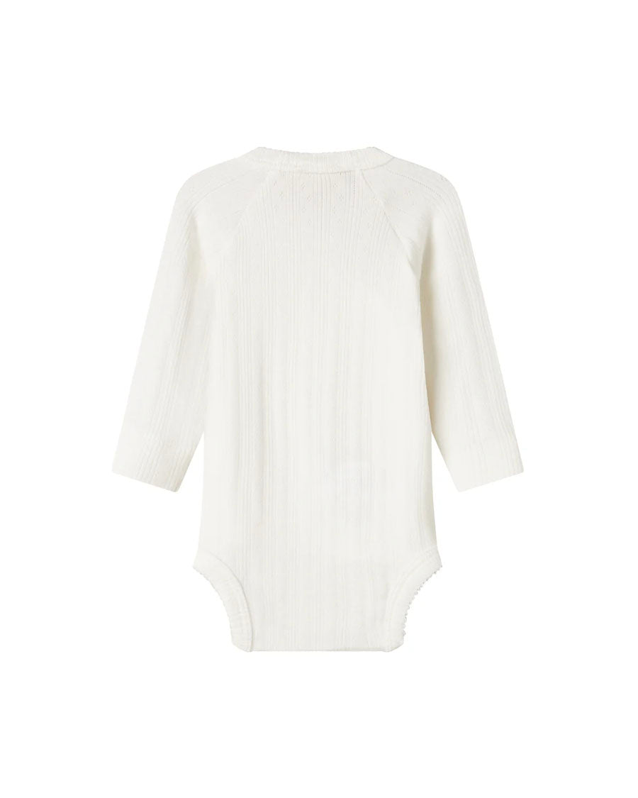 Long-sleeved pointelle bodystocking for newborns with wrap-around closure. The bodystocking closes with snaps and ties and has fine picot edges. The bodystocking is soft, stretchy and comfortable to wear.
