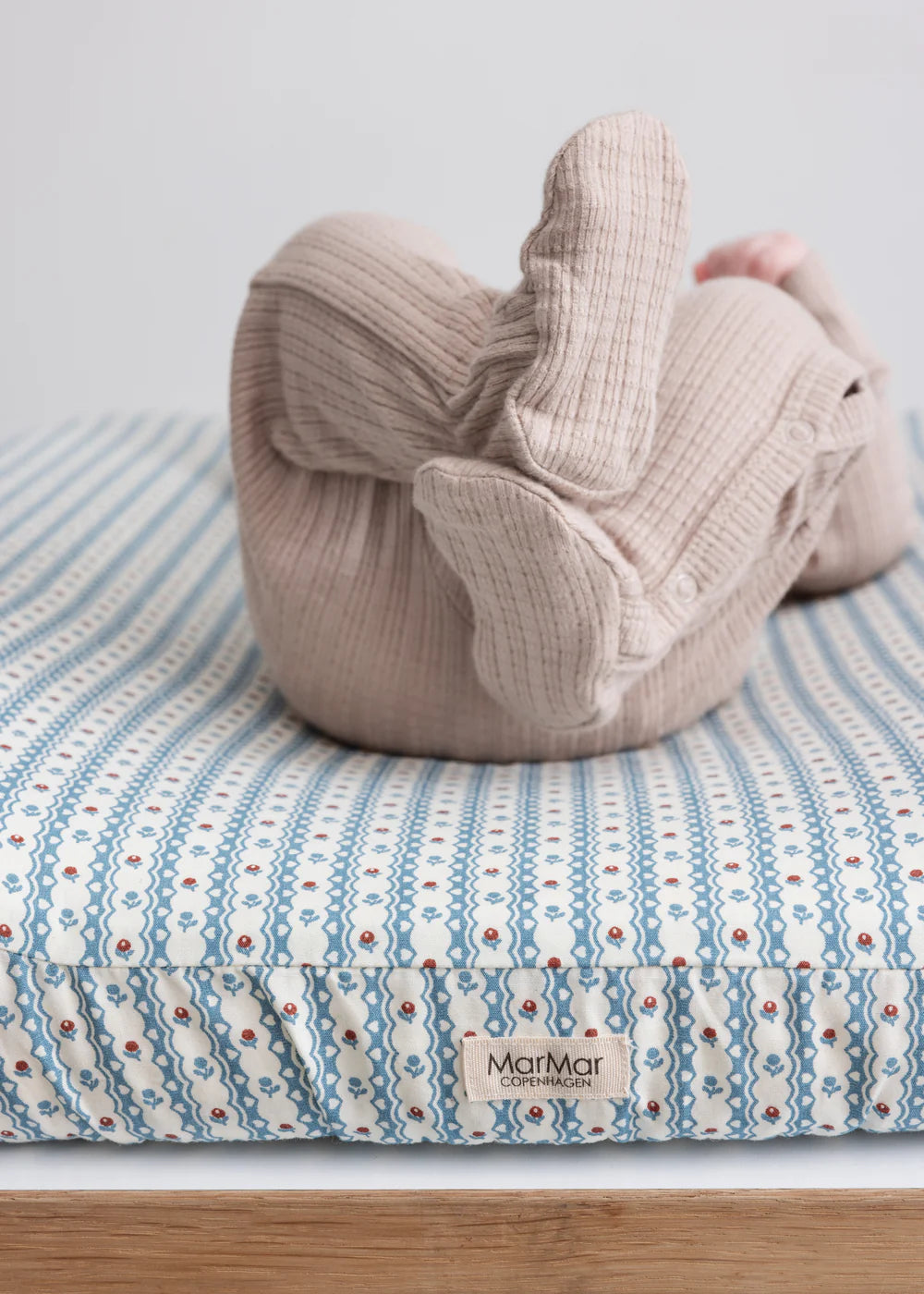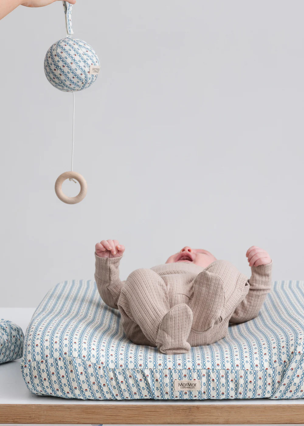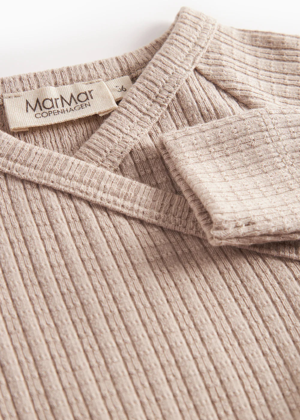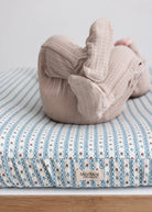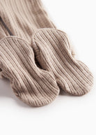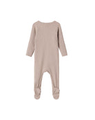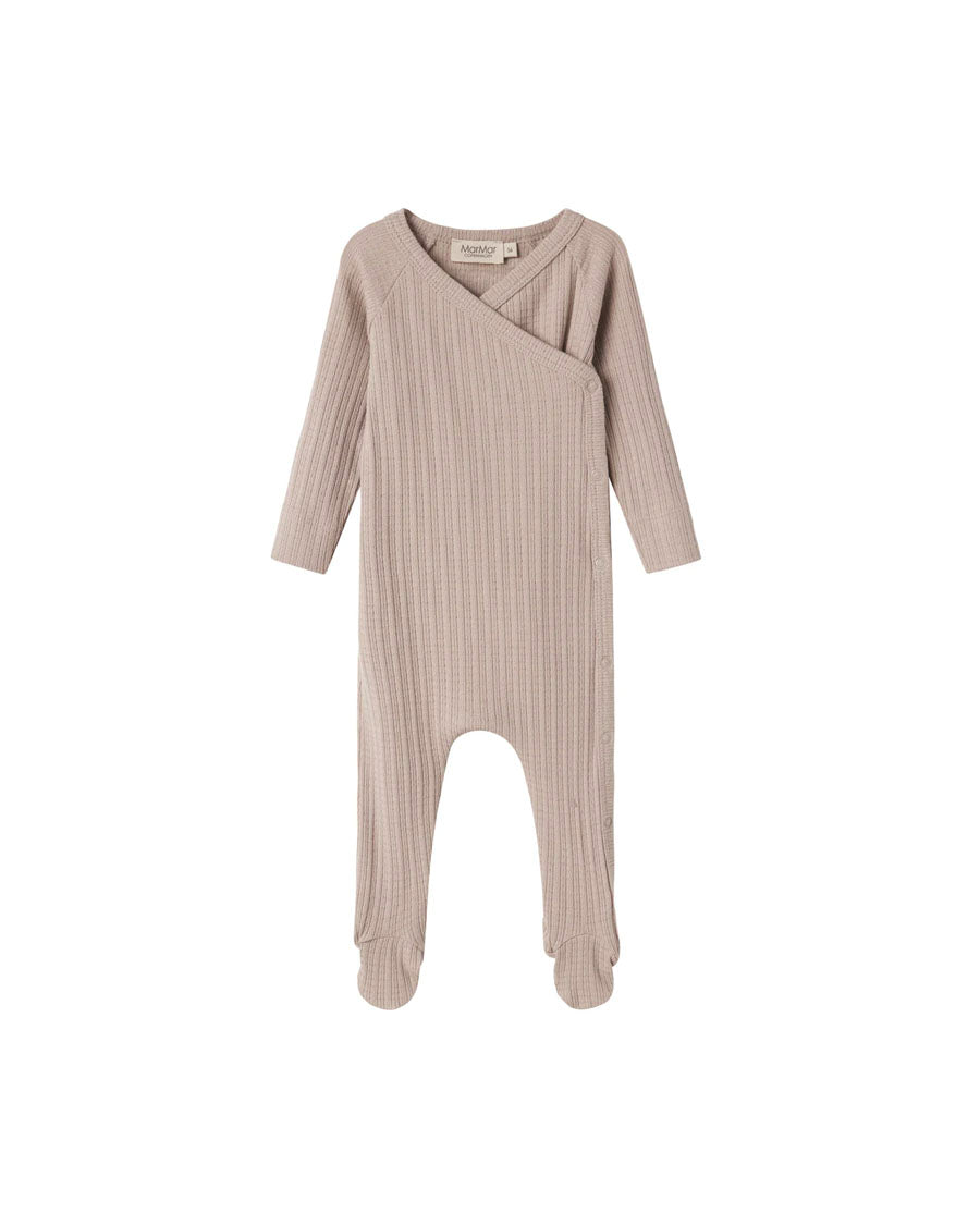 Long-sleeved pointelle onesie with feet for newborns. The onesie has a wrap-around closure and closes with snaps from the neck and down one leg. The onesie is soft, stretchy and comfortable to wear.