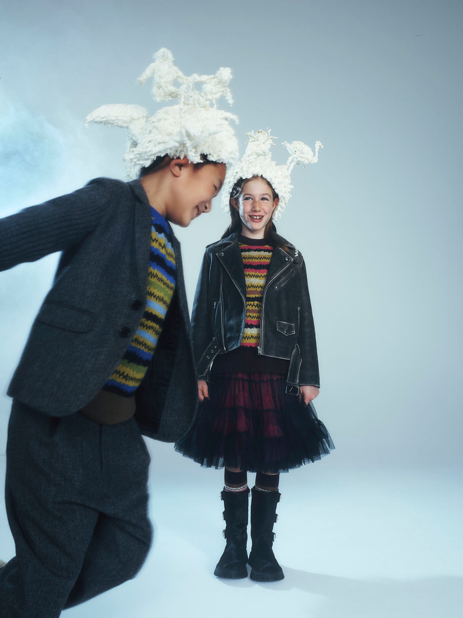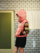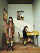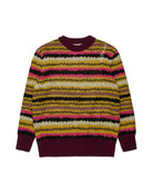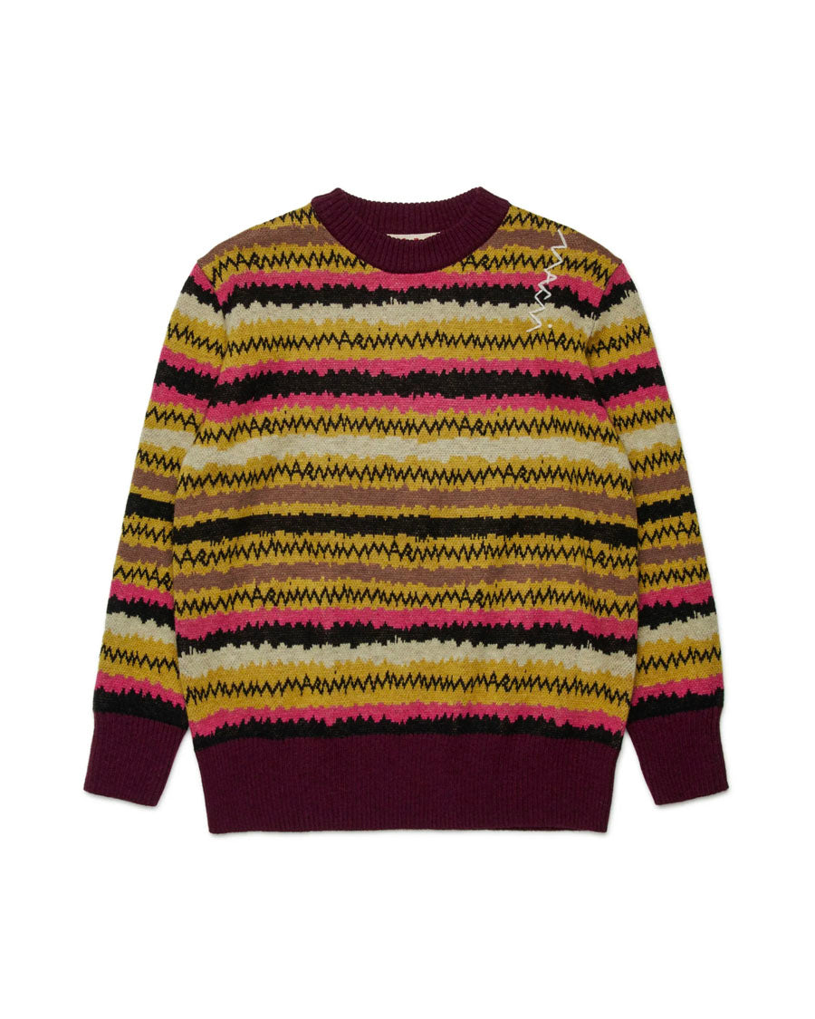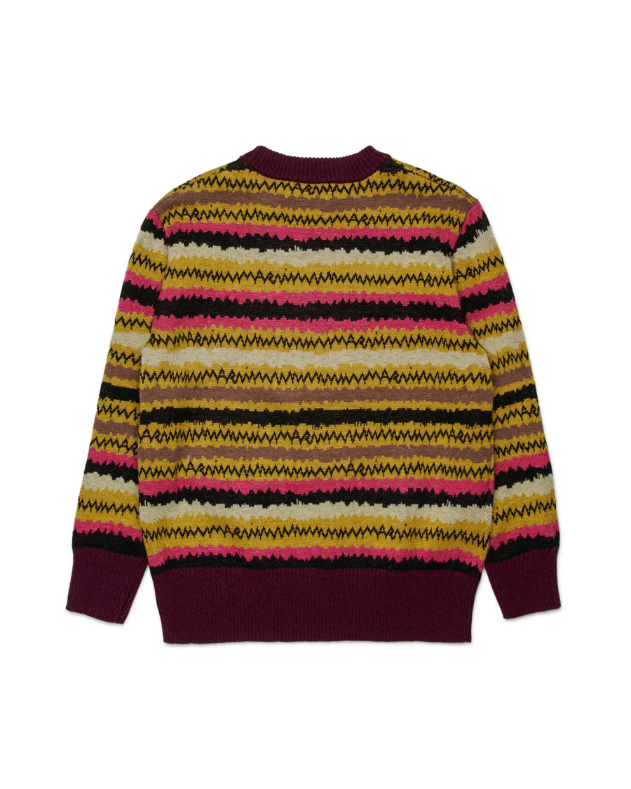- Striped jacquard design in yellow, pink, black, and burgundy