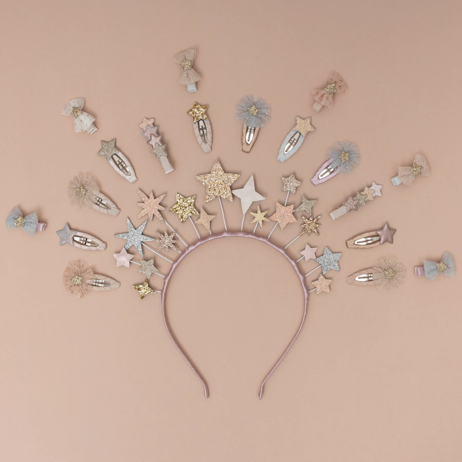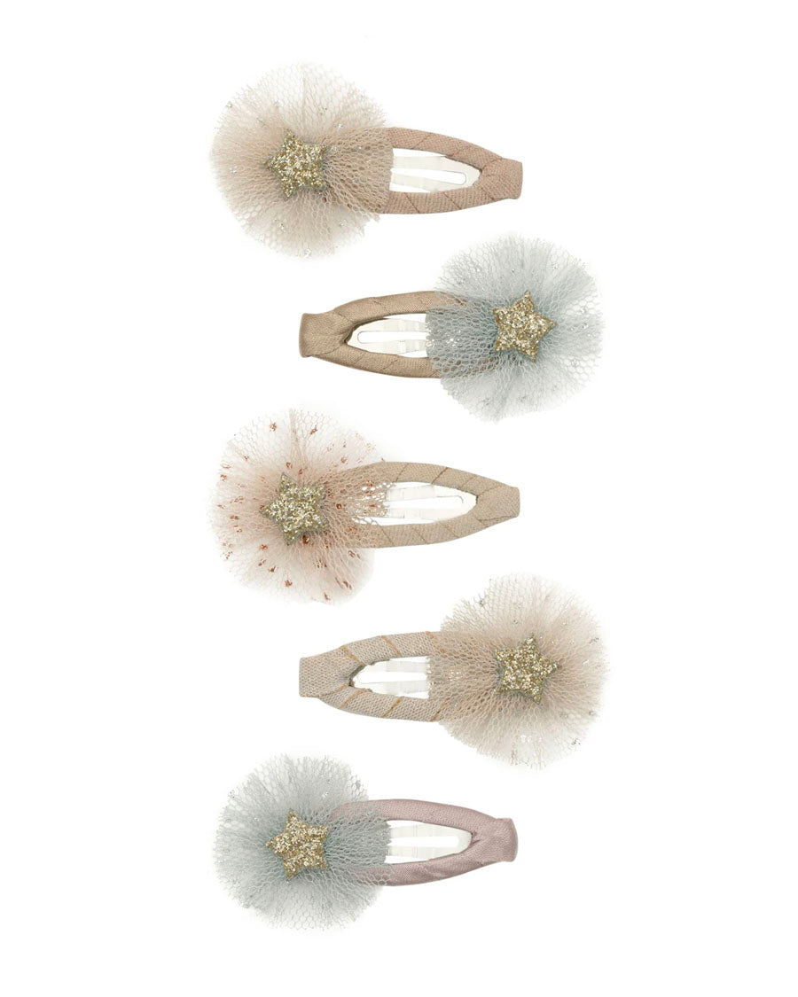 - 4cm ribbon wrapped clic clac clips featuring gold glitter star centres, layered over soft tulle rosettes flecked with sparkle