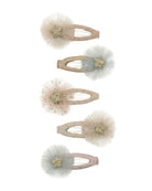 Add a sprinkle of enchanting sparkle to your little one’s look with our mini tulle rosette clic clacs. Featuring soft, delicate tulle rosettes and shimmering gold glitter star centres, these sweet accessories bring playful charm to any hairstyle. Perfect for party days, dress-up adventures, or simply shining bright every day.