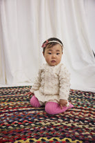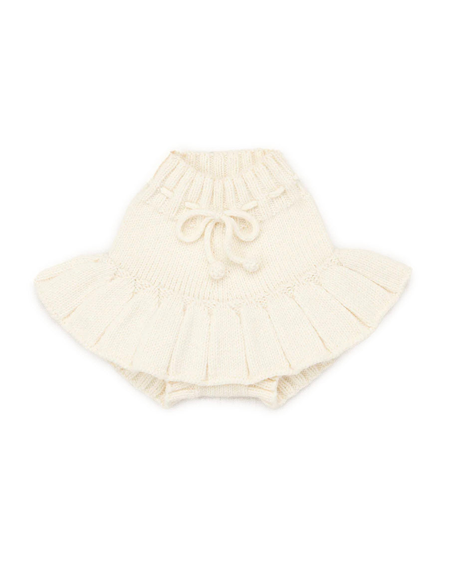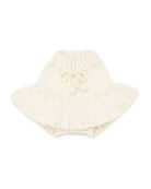 A hand-knit skirt in Merino wool, featuring attached bloomers with ribbed cuffs and a ribbed waistband with a popcorn tie drawstring for a secure fit.
