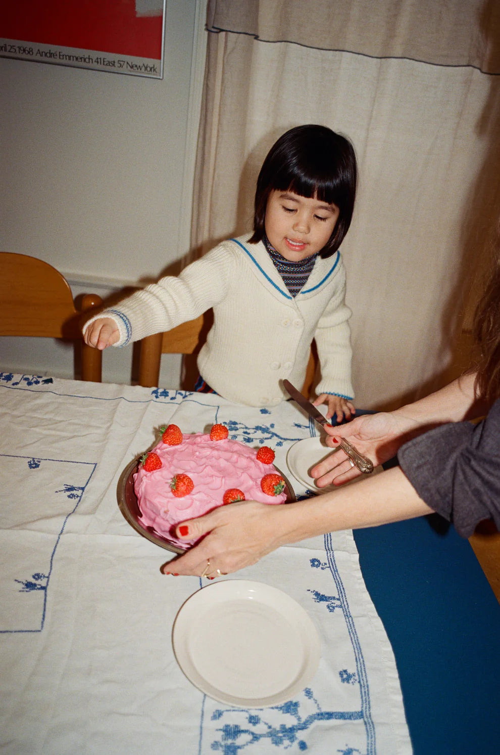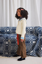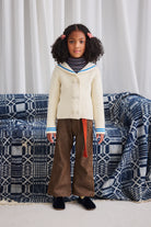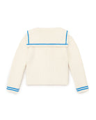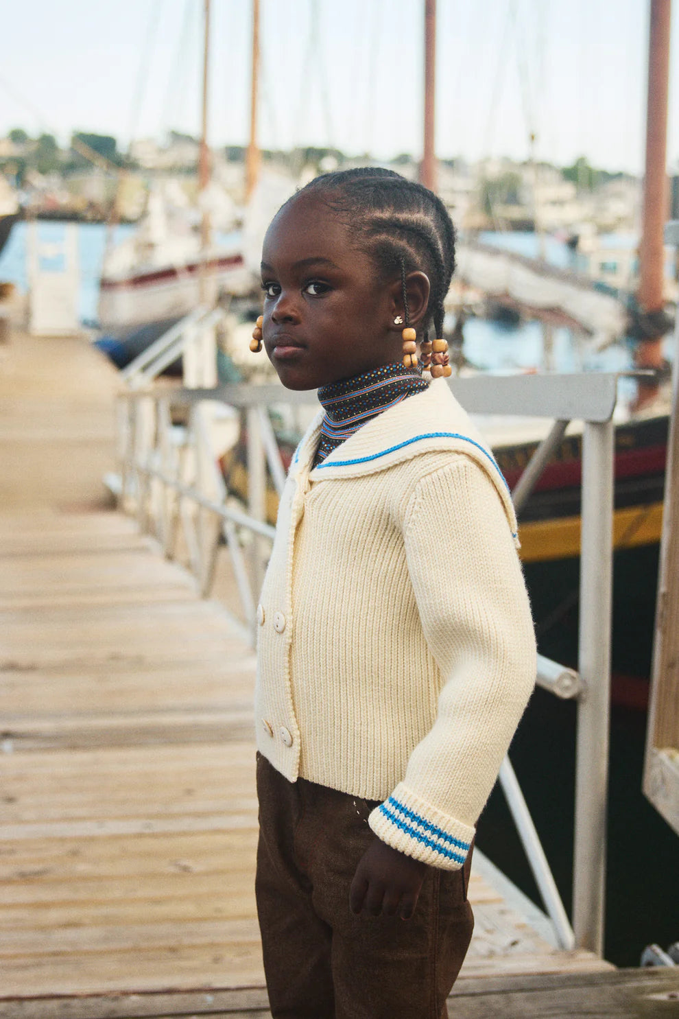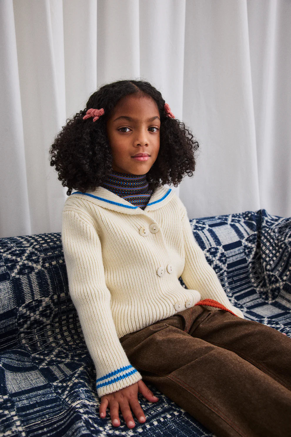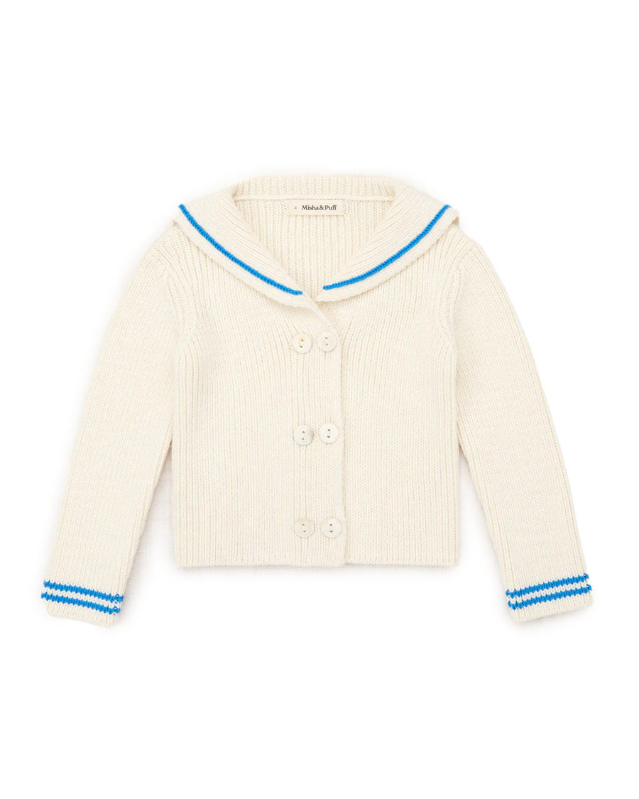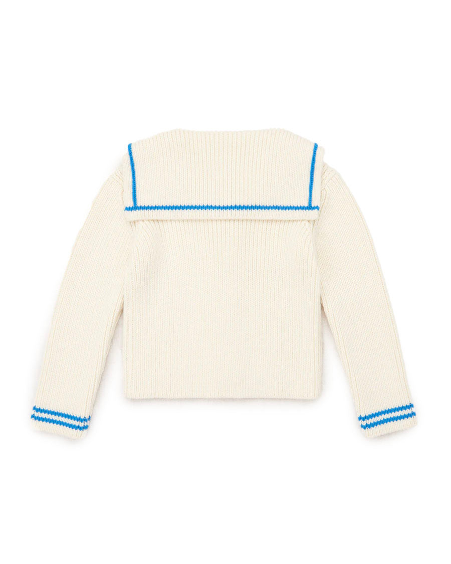 A boxy, vintage-style ribbed cardigan in a Merino wool knit, featuring a sailor collar with contrast stripe trim.
