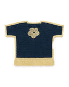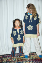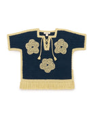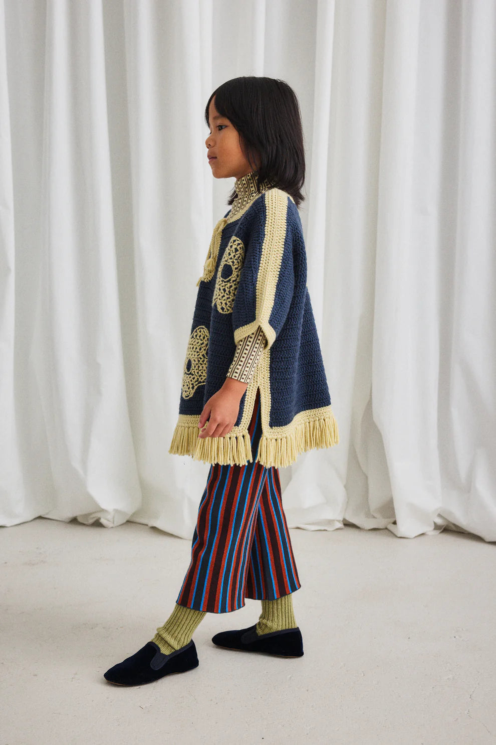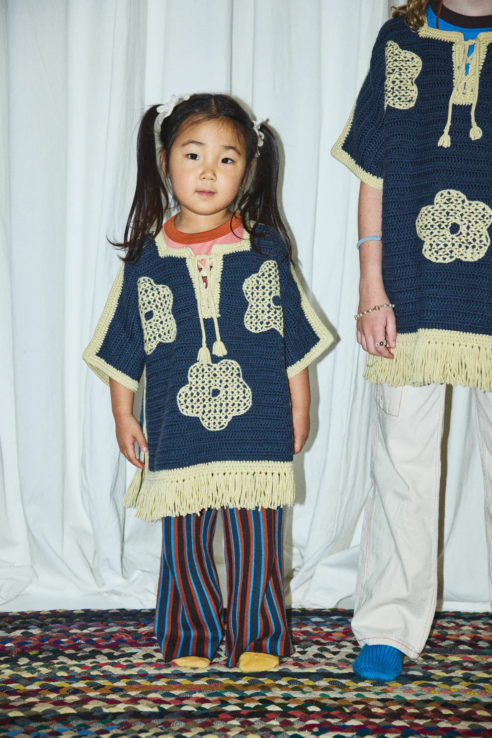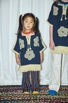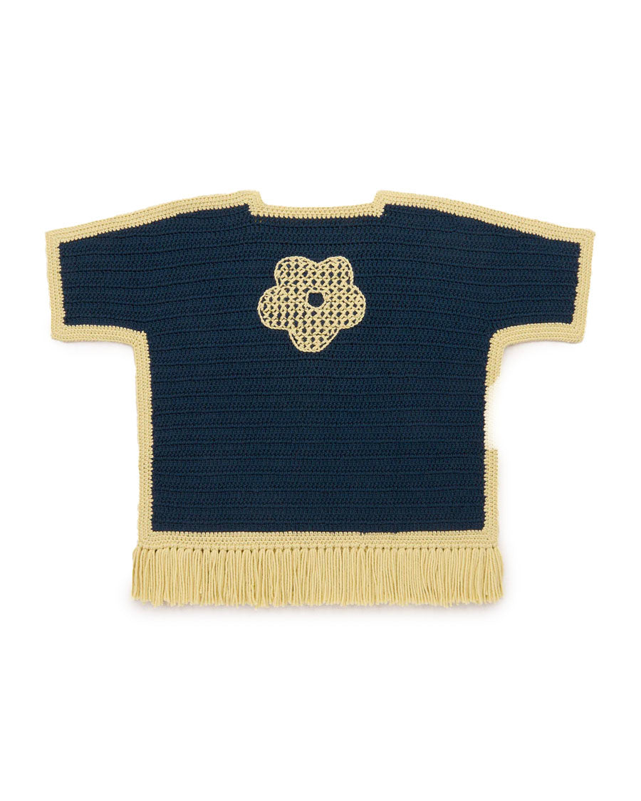 A hand-crocheted, vintage-inspired poncho in Merino wool, featuring a placket with lace-up tie tassel closure and tassel fringe trim. Finished with large hand-embroidered floral motifs.