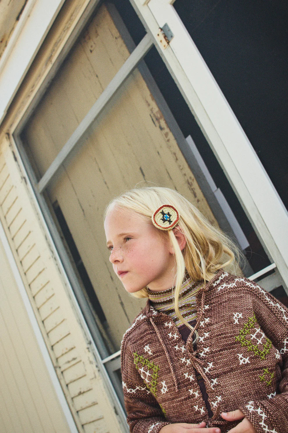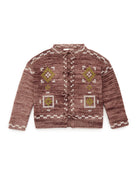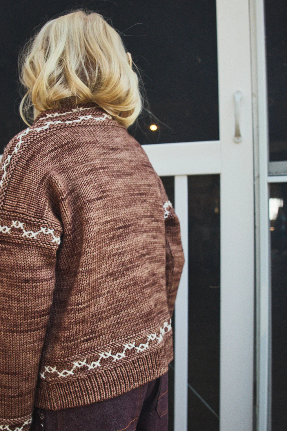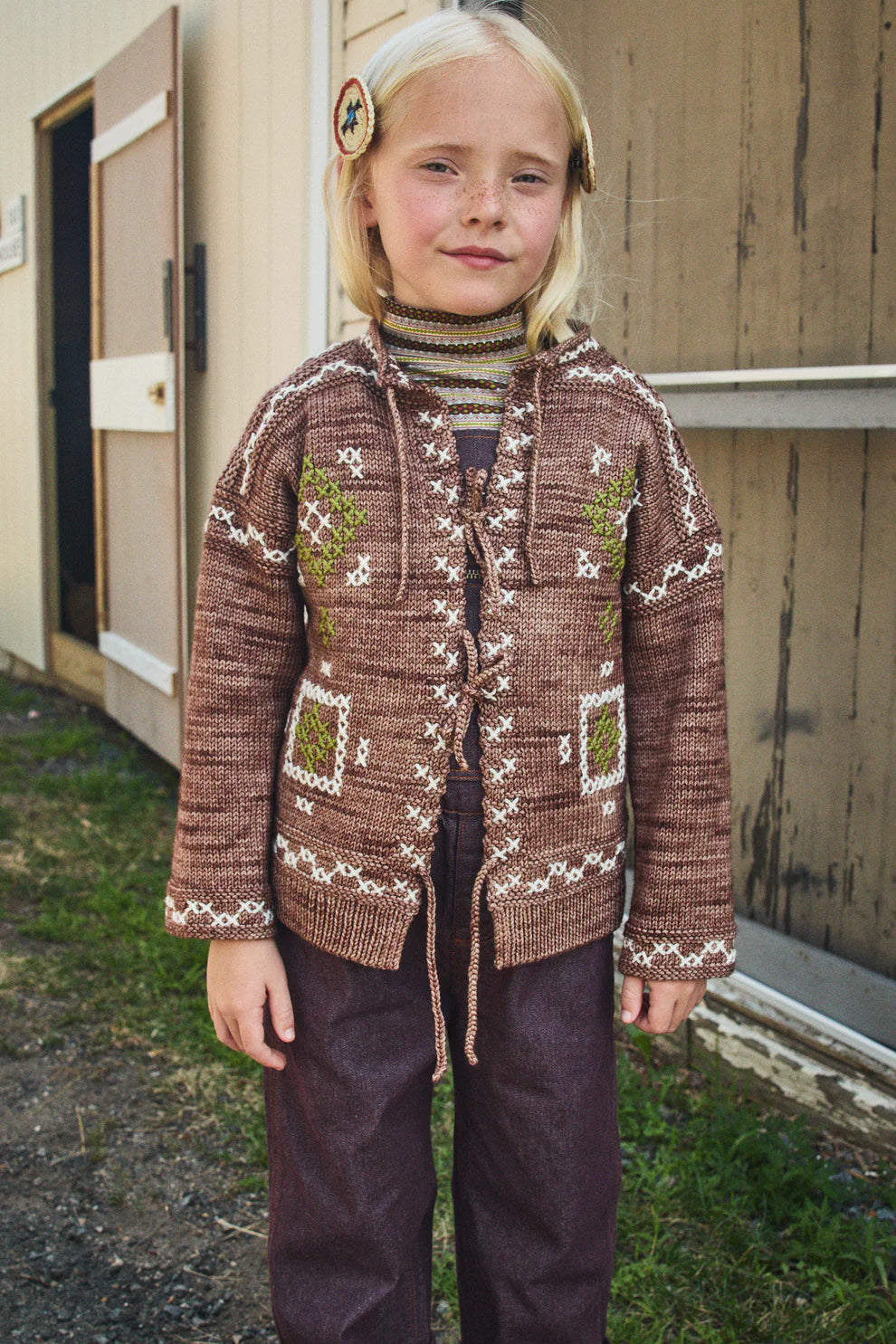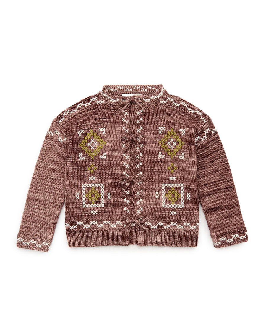 A Scandi-inspired cardigan in Merino wool, with a short stand collar, ribbed hem, and a tie-front closure. Finished with hand-embroidered cross-stitch designs.