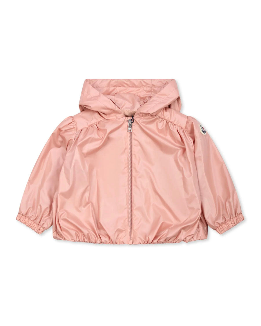Pink, lightweight, windbreaker jacket with long sleeves, hood, front zip fastening, side pockets, elasticated cuffs and hem. It is embellished with an iconic logo patch applied on the sleeve.