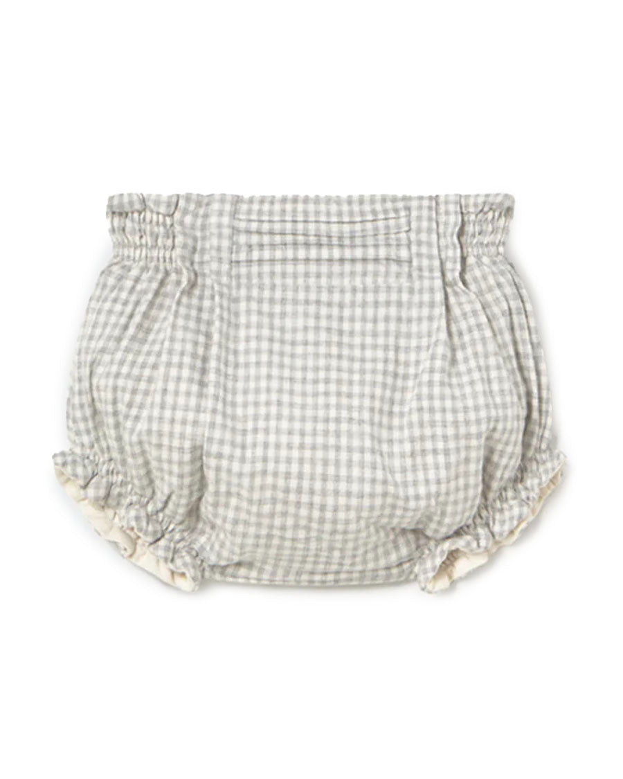 These newborn bloomers are made from soft, brushed flannel in a classic gingham plaid pattern, crafted from 100% sustainable cotton. Featuring pin tucks and vertical pleats at the center front, with smocking at the back waistband and leg openings. The leg openings are finished with a delicate ruffle trim. Fully lined for extra comfort and warmth.