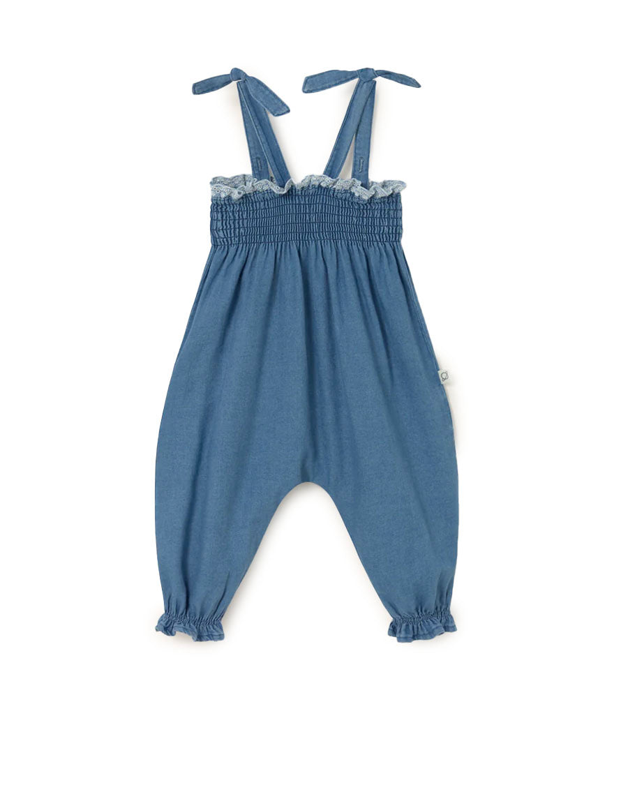 Baby girls’ overalls in lightweight chambray denim. Featuring adjustable straps tied with bows, a straight neckline trimmed with embroidered lace, and a smocked bodice. Finished with elastic hems and delicate ruffle trim for a comfortable fit.