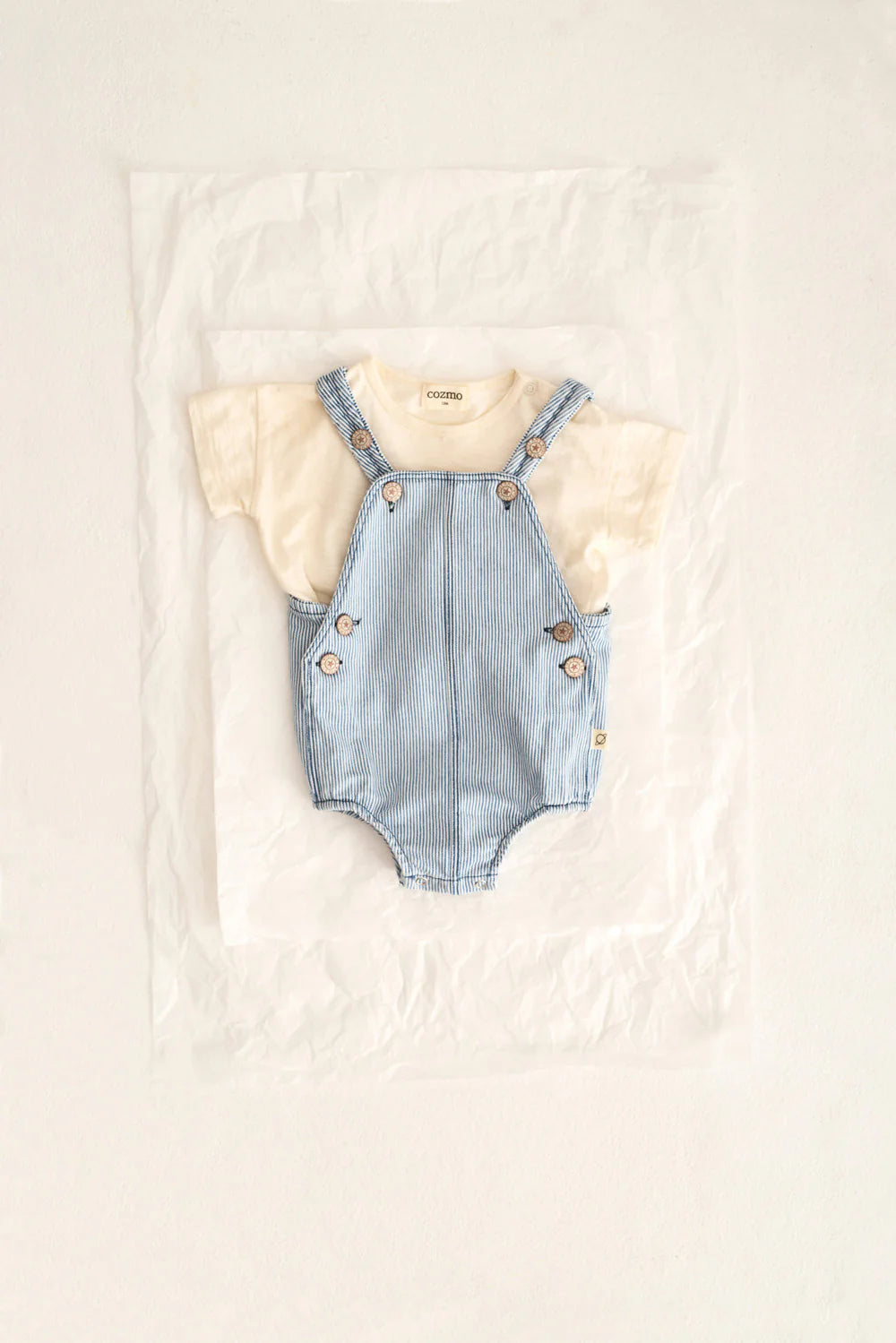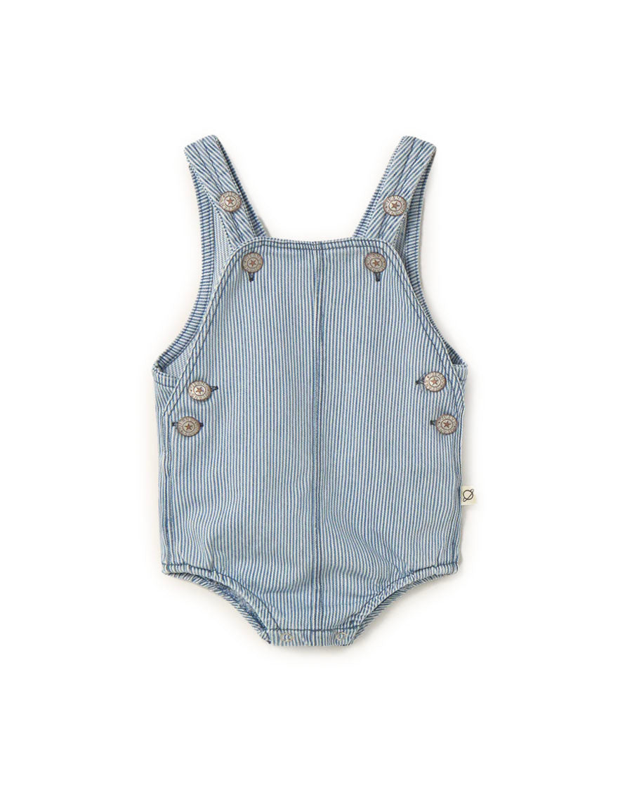 Baby striped denim romper with V-shaped adjustable straps at the back that tie at the front with a denim-style button. It features central seams at the front and back, double denim-style buttons at the waist on each side, elasticated leg openings, and snap buttons at the gusset for easy dressing.