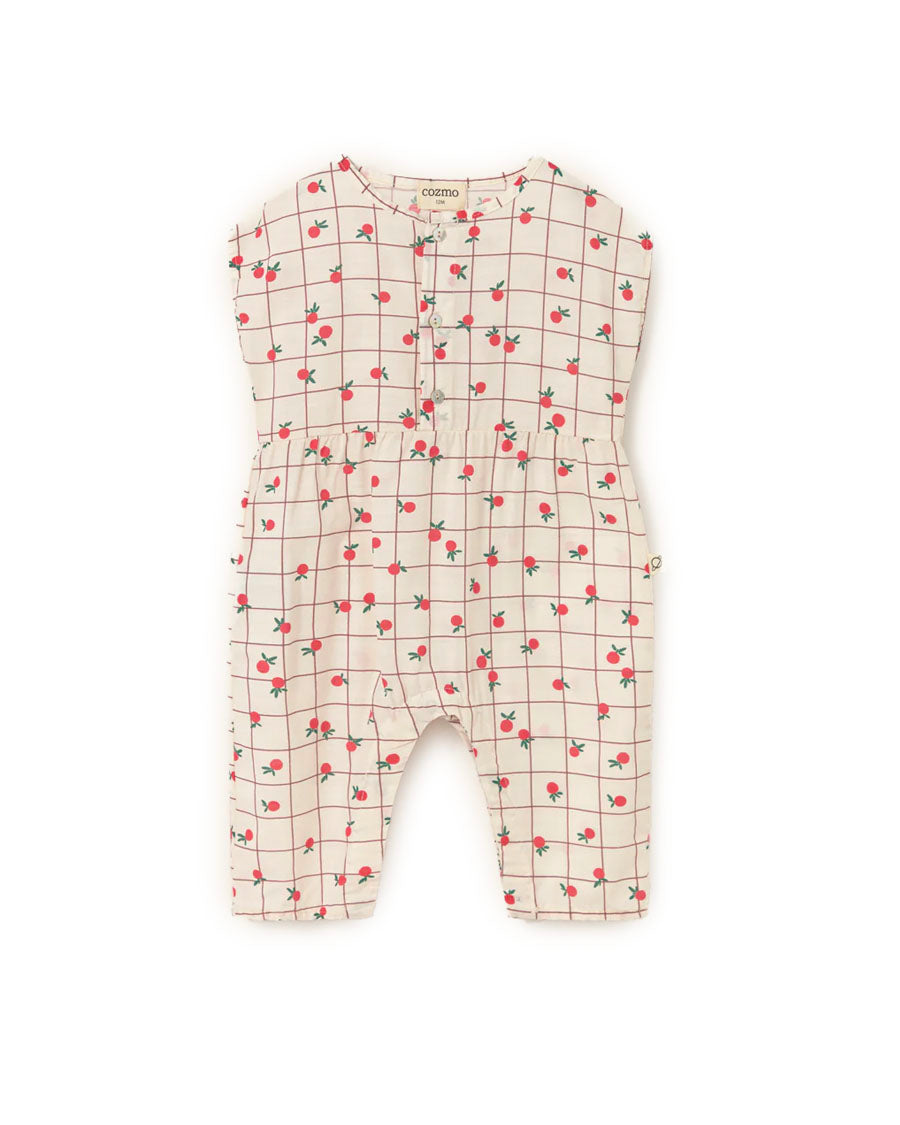 Sleeveless jumpsuit in breezy poplin cotton with a fun fruit print and a subtle slub texture. Round neckline with buttons at the front. Gathered at the waistline. Snap buttons alongside the legs.