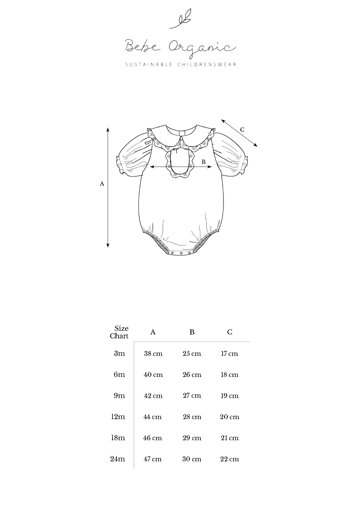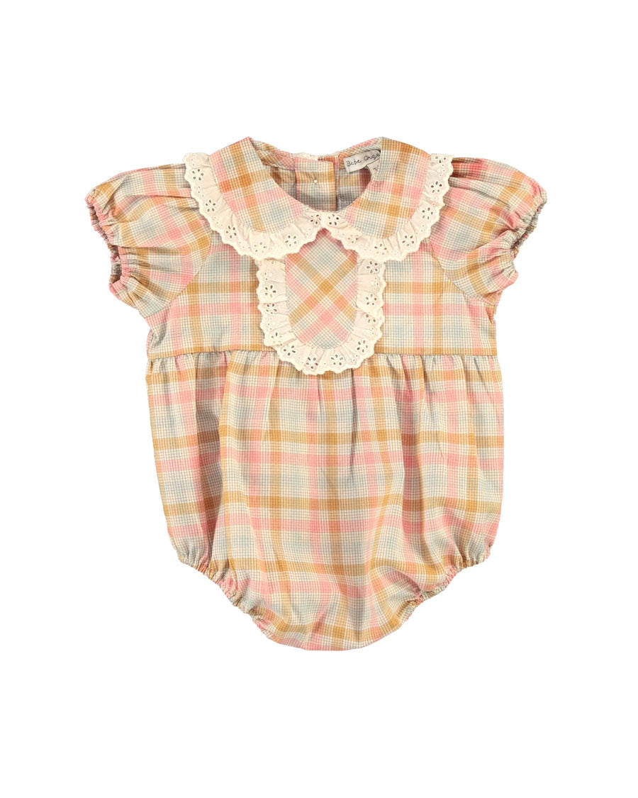 Adorable Camille romper in pink-toned checked cotton fabric. Features a beautiful balloon silhouette with an elegant collar and ruffled bib, and an elasticated gathering on the sleeves and legs. Back closure with mother-of-pearl buttons and snaps between legs for comfortable change. Truly beyond beautiful romper for this spring/summer season celebrations.