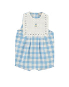 Our new adorable vintage-style baby romper for this spring/summer season. Mateus romper in sailor check features a truly beautiful sleeveless silhouette and vintage-inspired square collar with signature sailor embroidery. Crafted from the softest cotton. Closes with mother-of-pearl buttons in the back and snaps between legs for an easy change.