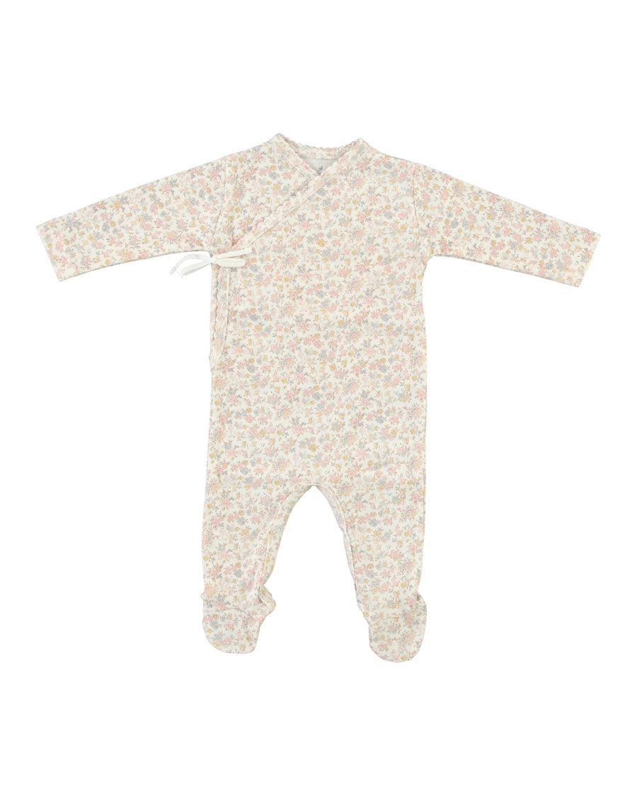 A lovely wrap overall is the ultimate item for all babies, and especially for newborns. Extremely soft overall in the softest cotton in signature retro floral print with covered toes, snaps for an easy change, and long sleeves to give that extra comfort and coziness to the little ones. Matches perfectly with the Iris bonnet and blanket. Perfect for gifting!
