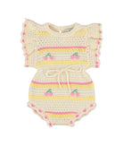 Knit of our dreams! Bebe Organic signature crochet style knitwear inspired by bohemian beach holidays. Paloma romper in crochet knit with lovely cherry motif is made of organic cotton yarn. Most adorable romper features butterfly sleeves and a drawstring at the waistline for an elegant and comfortable fit. A lovely addition to your little one's spring/summer wardrobe.