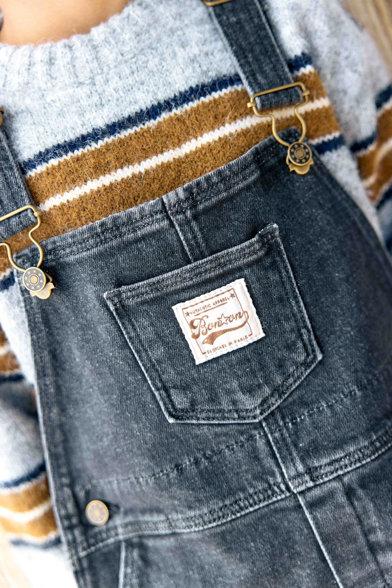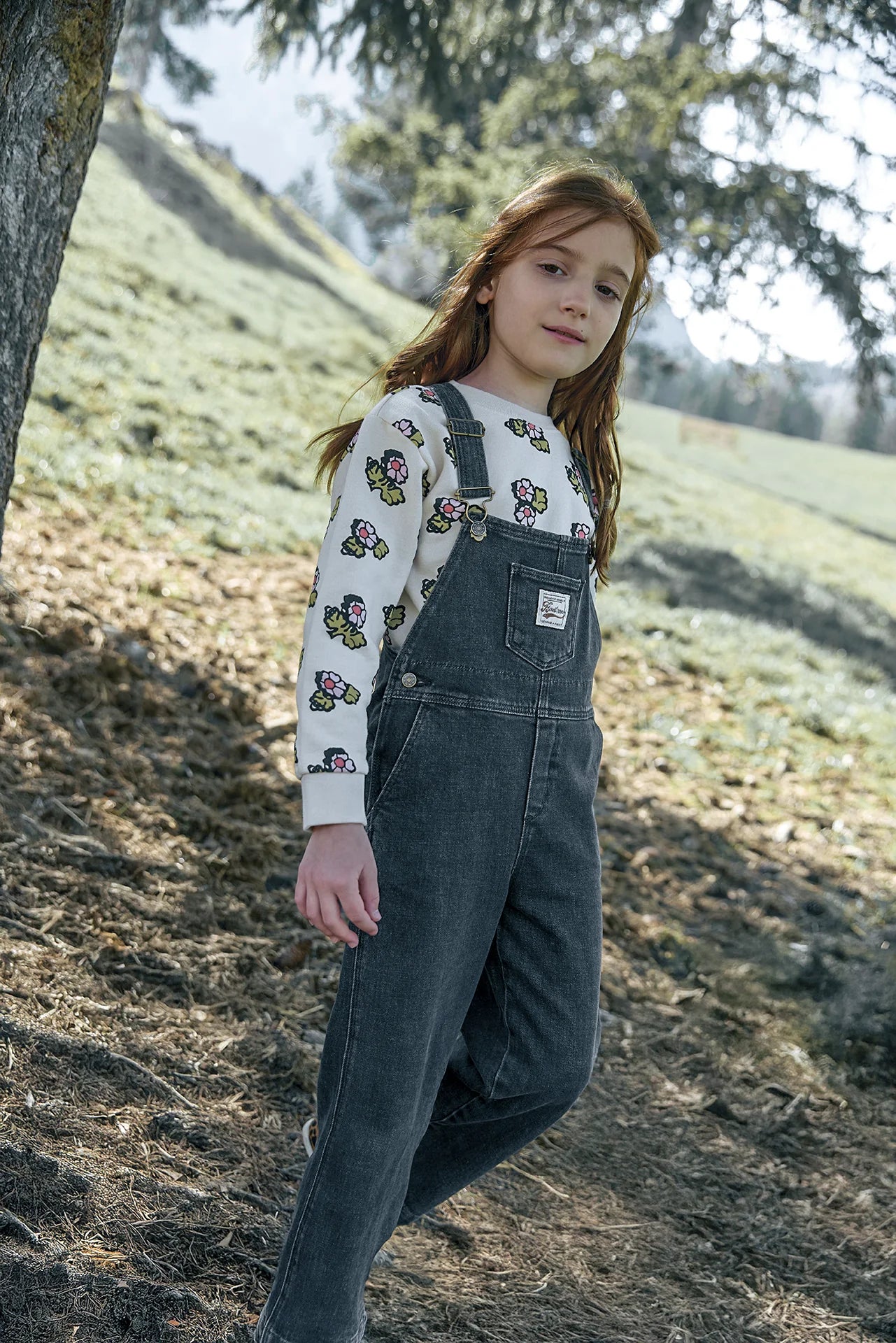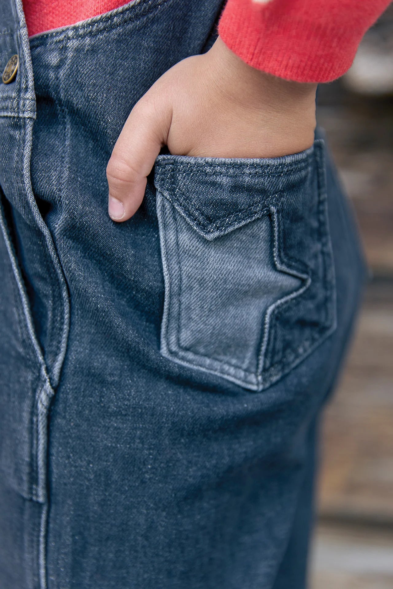 Fall for the Dungaree MOKA in denim Grey, Perfect for small explorers! With its Braces Adjustable and its straight cut, it ensures comfort and style. Its two front pockets and the star pocket on the back add a fun touch. Coming from the "Faroe Island" collection, it goes perfectly with a colorful t-shirt to go on an adventure with allure and fantasy!