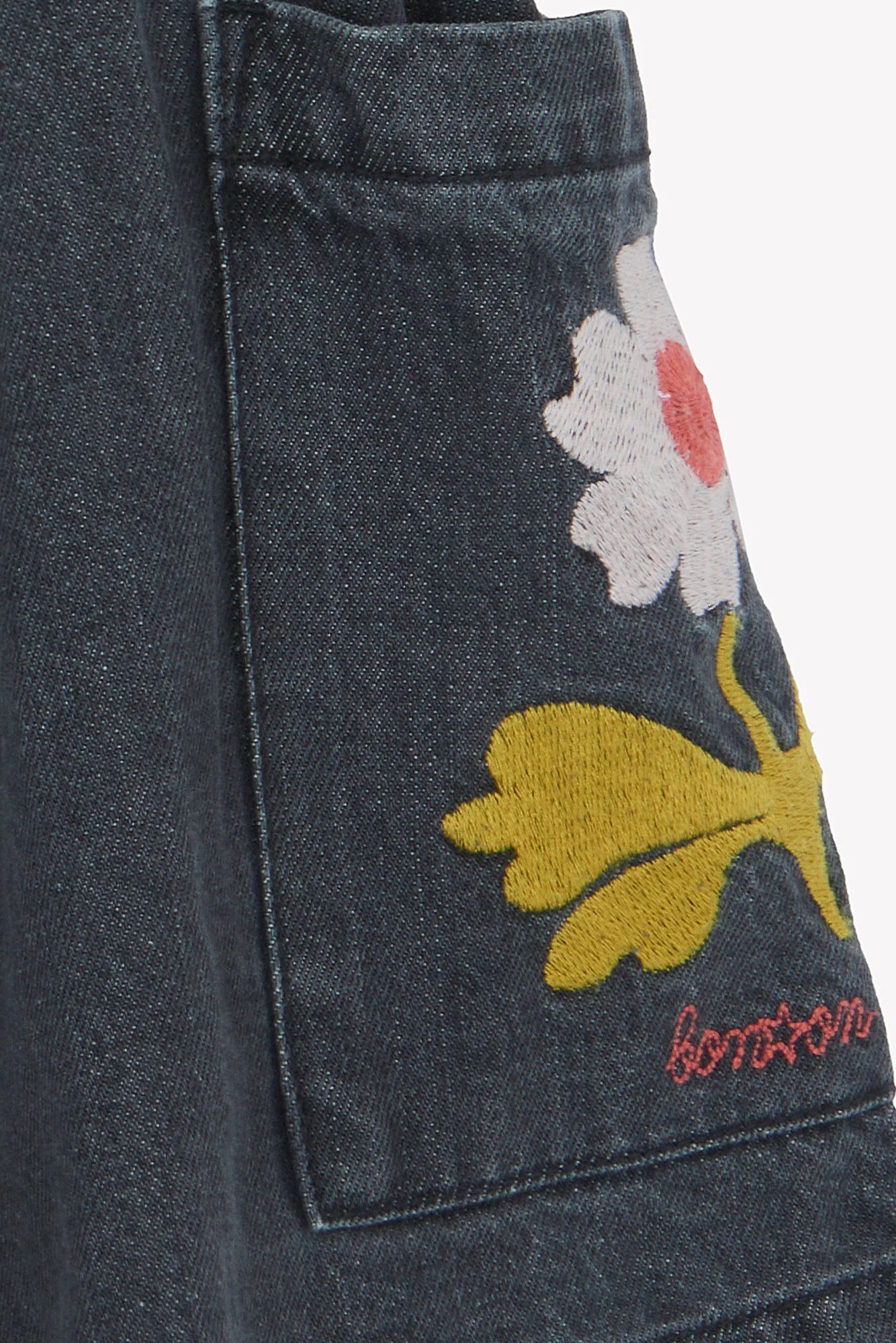 - Denim Grey and embroidered flowers.