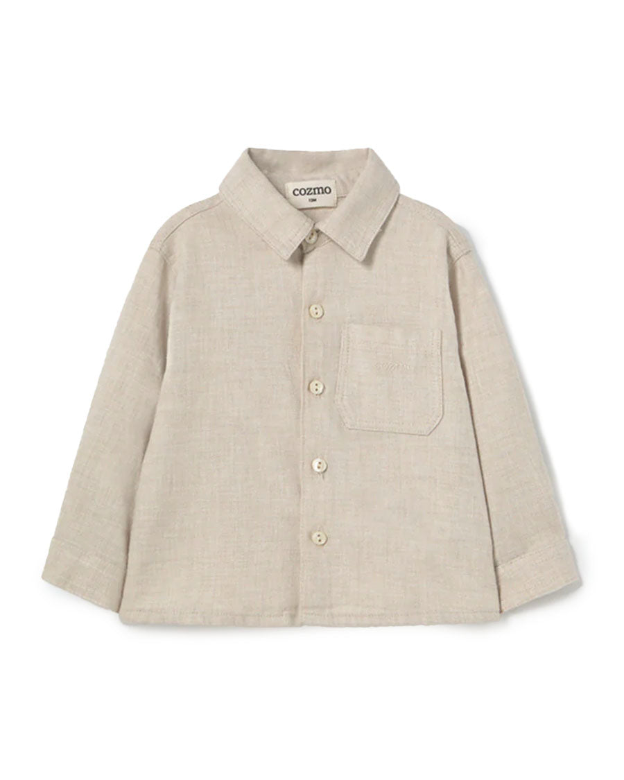 This baby boy shirt is made from cotton flannel with a mélange effect, crafted from 100% sustainable cotton. It features a classic collar, a button-down front placket, and a chest patch pocket with “Cozmo” embroidered on it. Buttoned cuffs offer a secure fit. Fully lined with a soft brushed knit for added warmth and comfort.