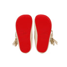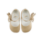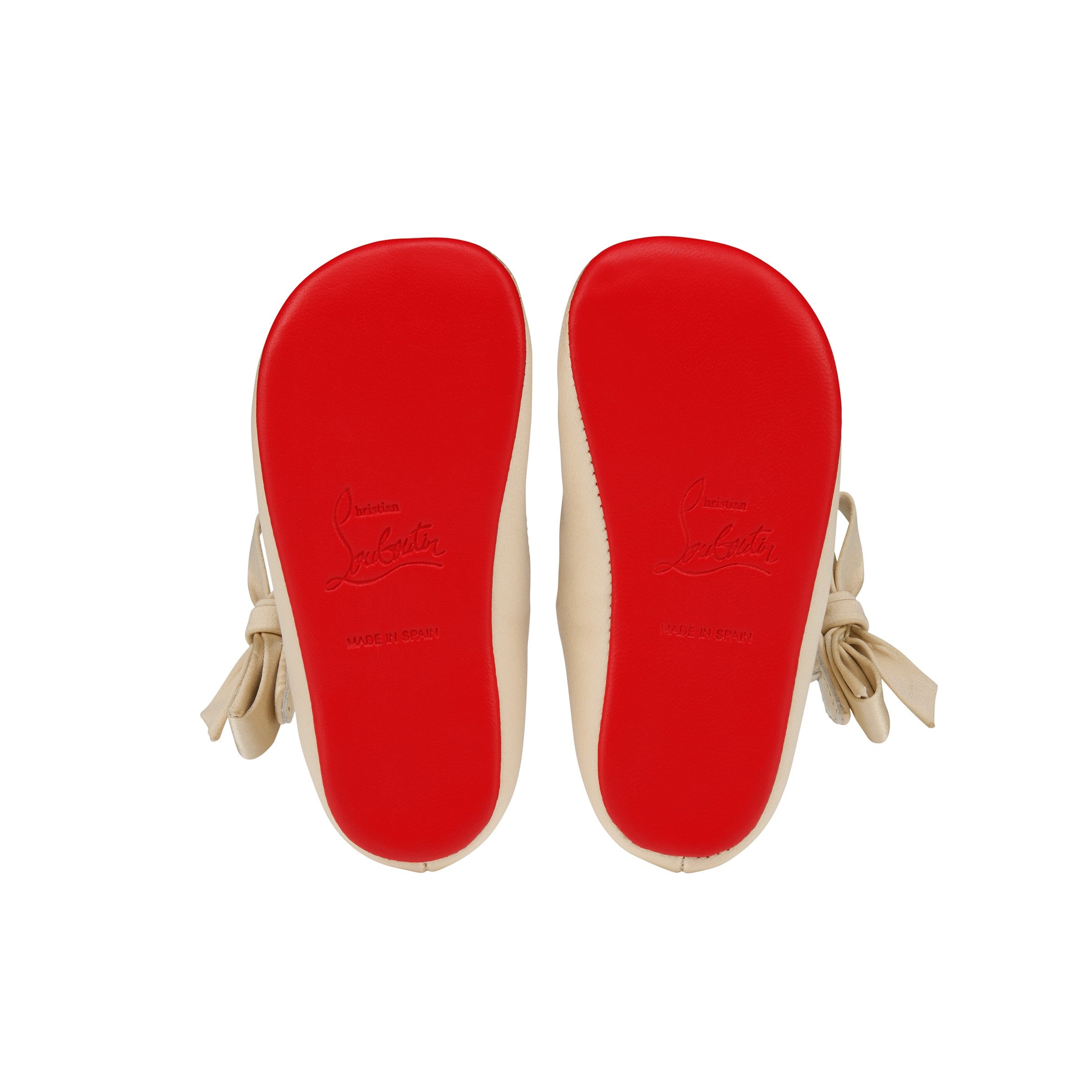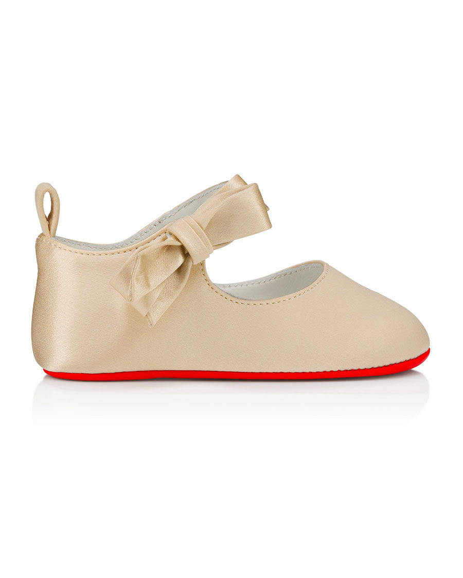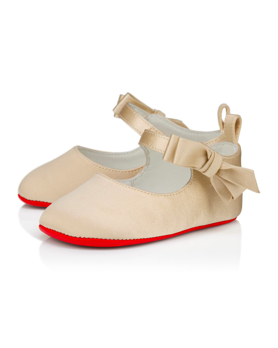 The Lou Babe pram shoe features the elegant styling of Maison Christian Louboutin's women's shoes. It is crafted in Beige Pastel crepe satin with white lining. This model features a Loubi red leather sole and a bow on the side.