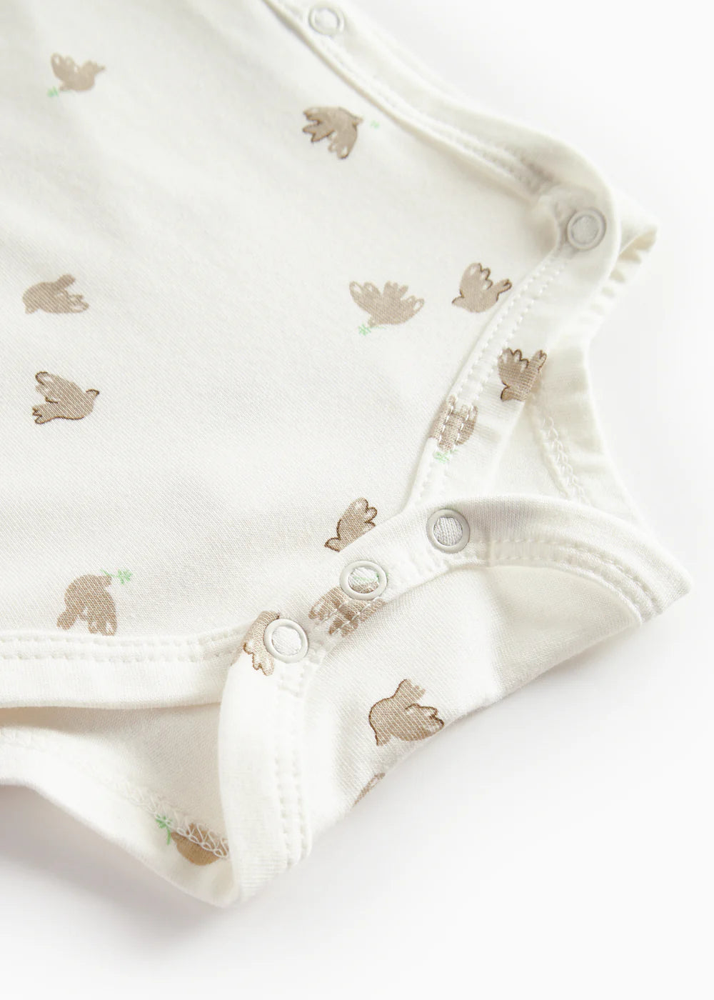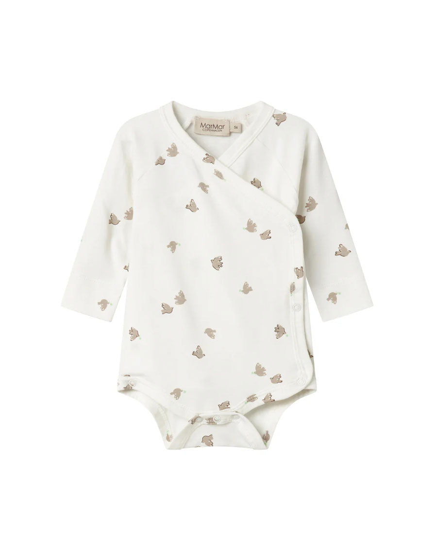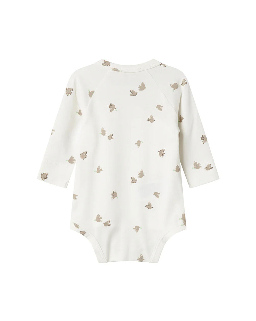 Long-sleeved bodystocking for newborns with a wrap-around closure. The bodystocking closes with snaps, has a nice print and is both soft, stretchy and comfortable to wear.