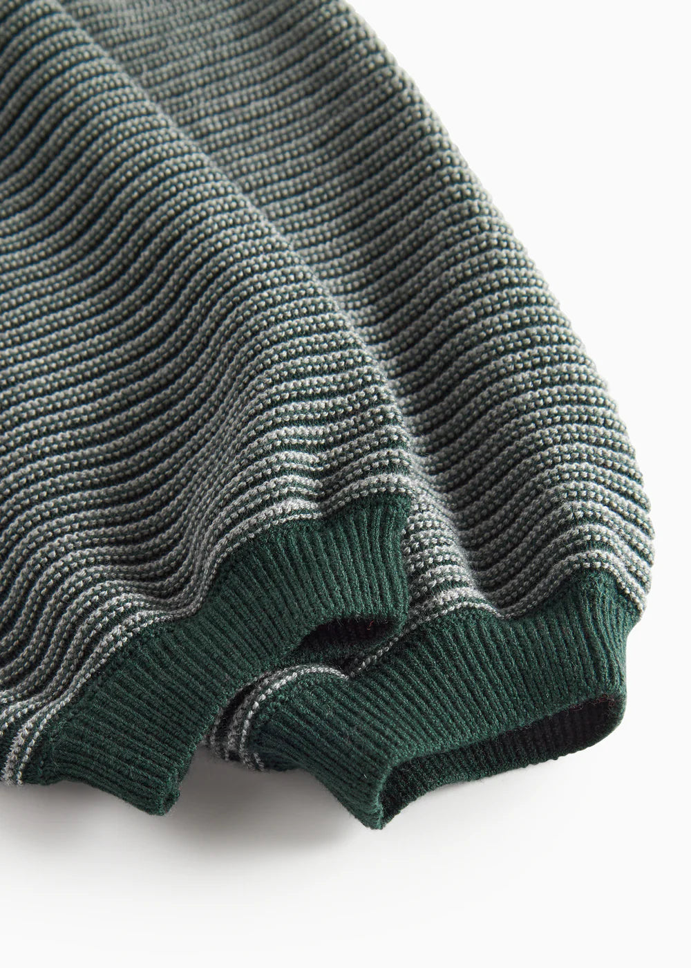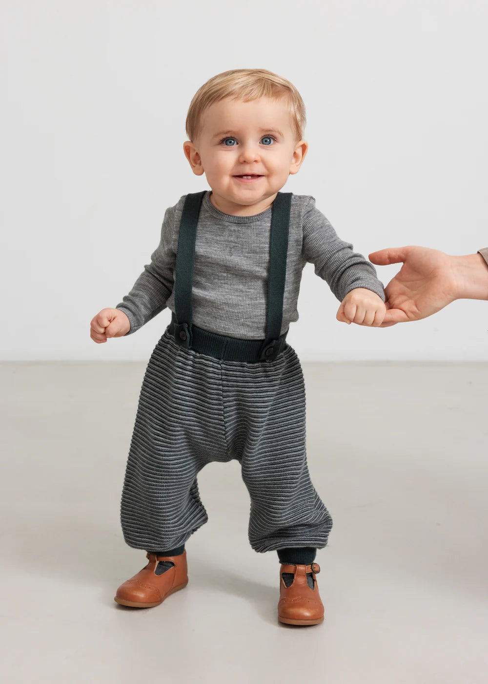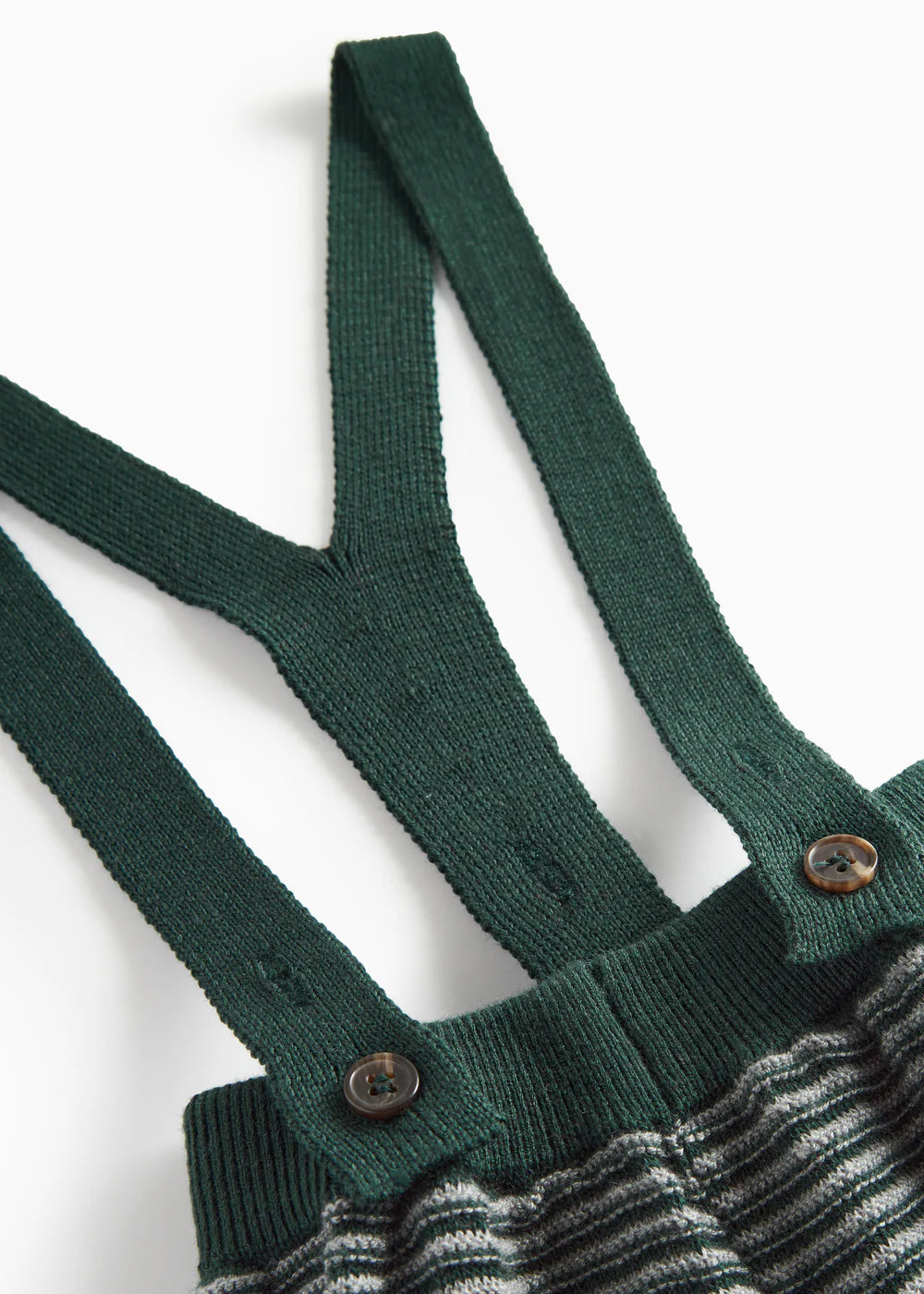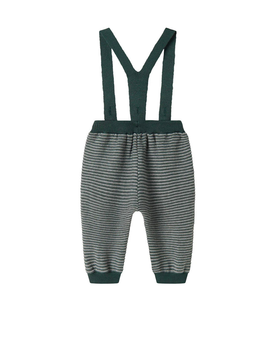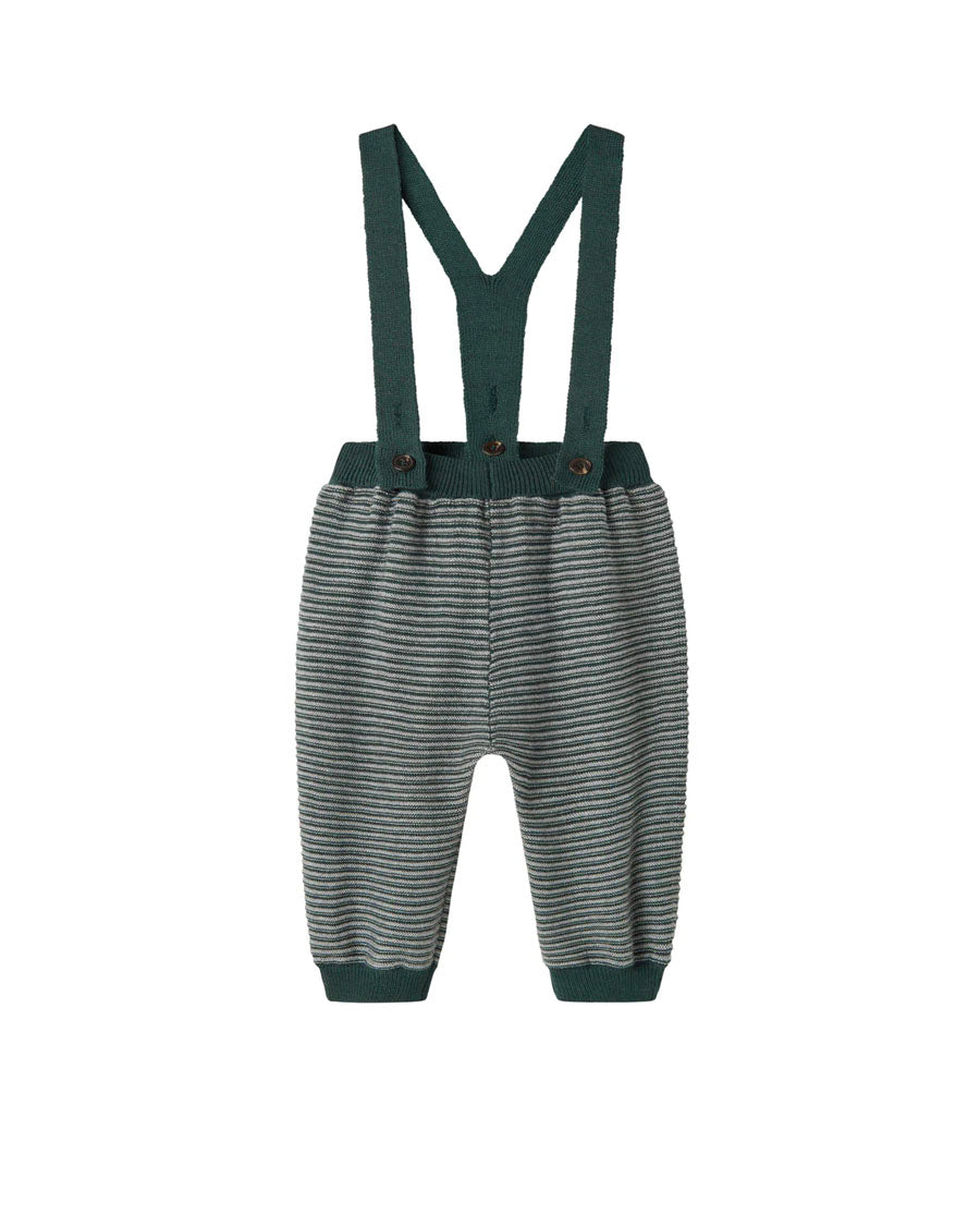 Loose-fitting trousers knitted with fine stripes. The trousers have suspenders with two button closure options. The trousers are both soft and comfortable to wear.