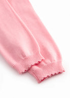 Knitted blouse for the little ones with raglan sleeves and button closure on the left side. The knitted blouse is in a stocking stitch with ribbed edges at the neck, sleeves and bottom, as well as wavy edges. The knitted blouse is comfortable and easy to wear.