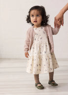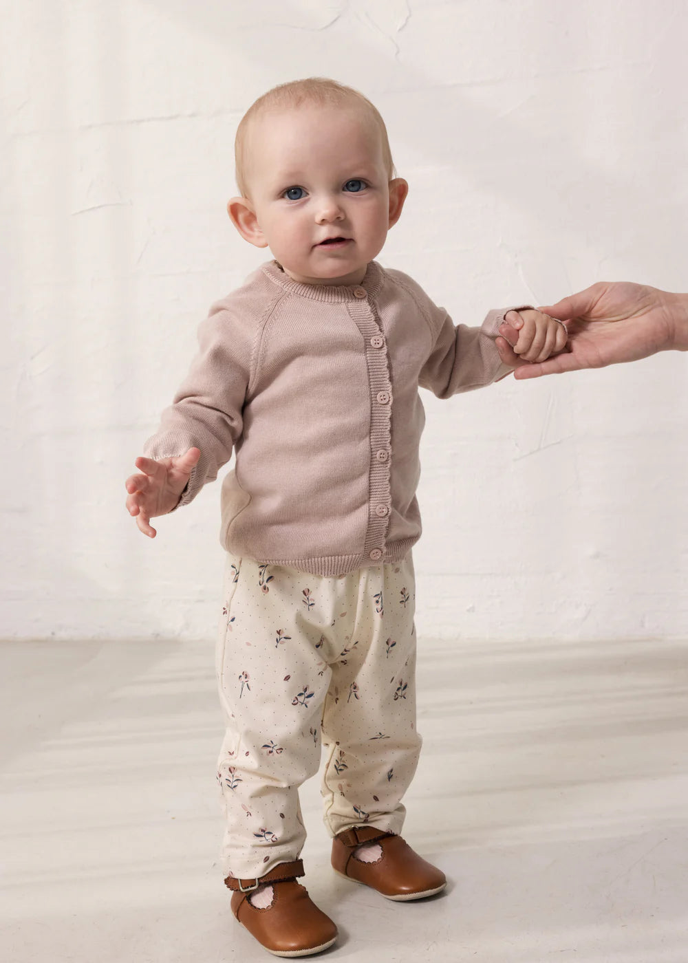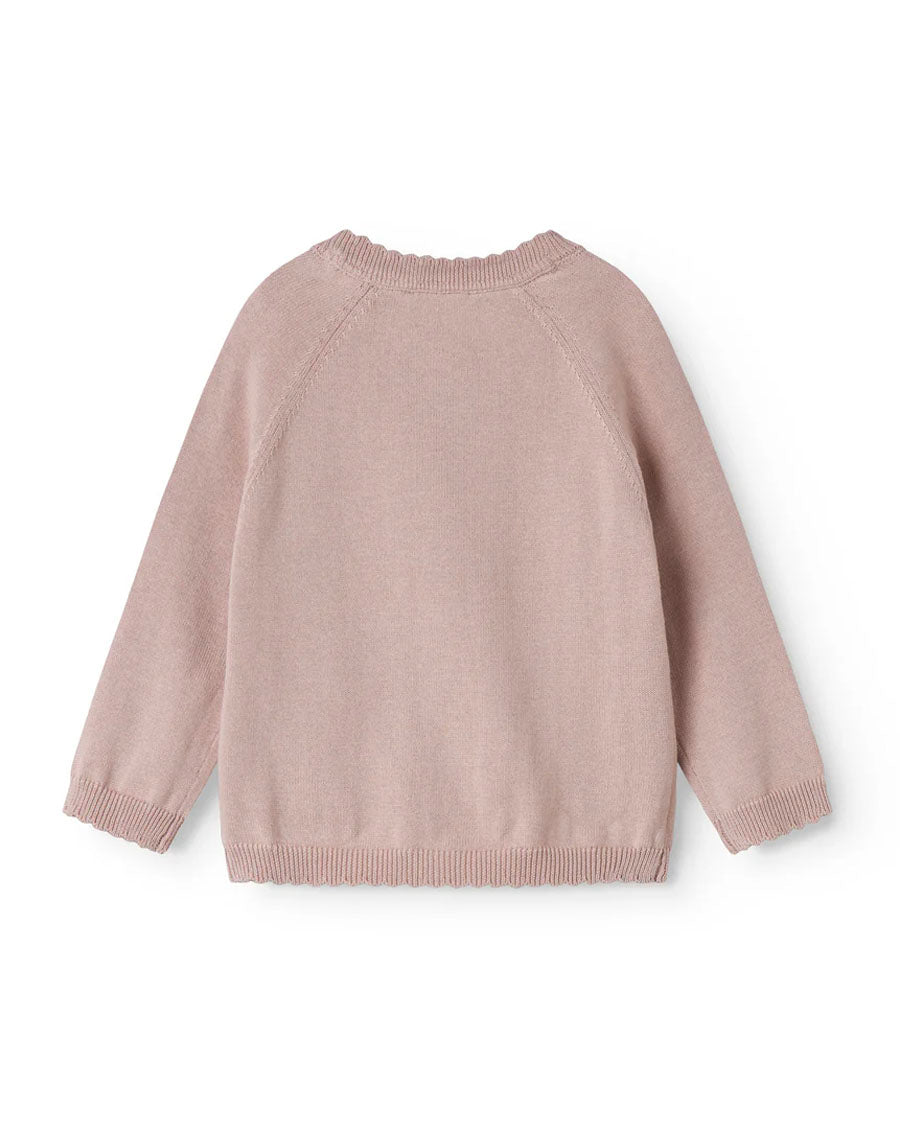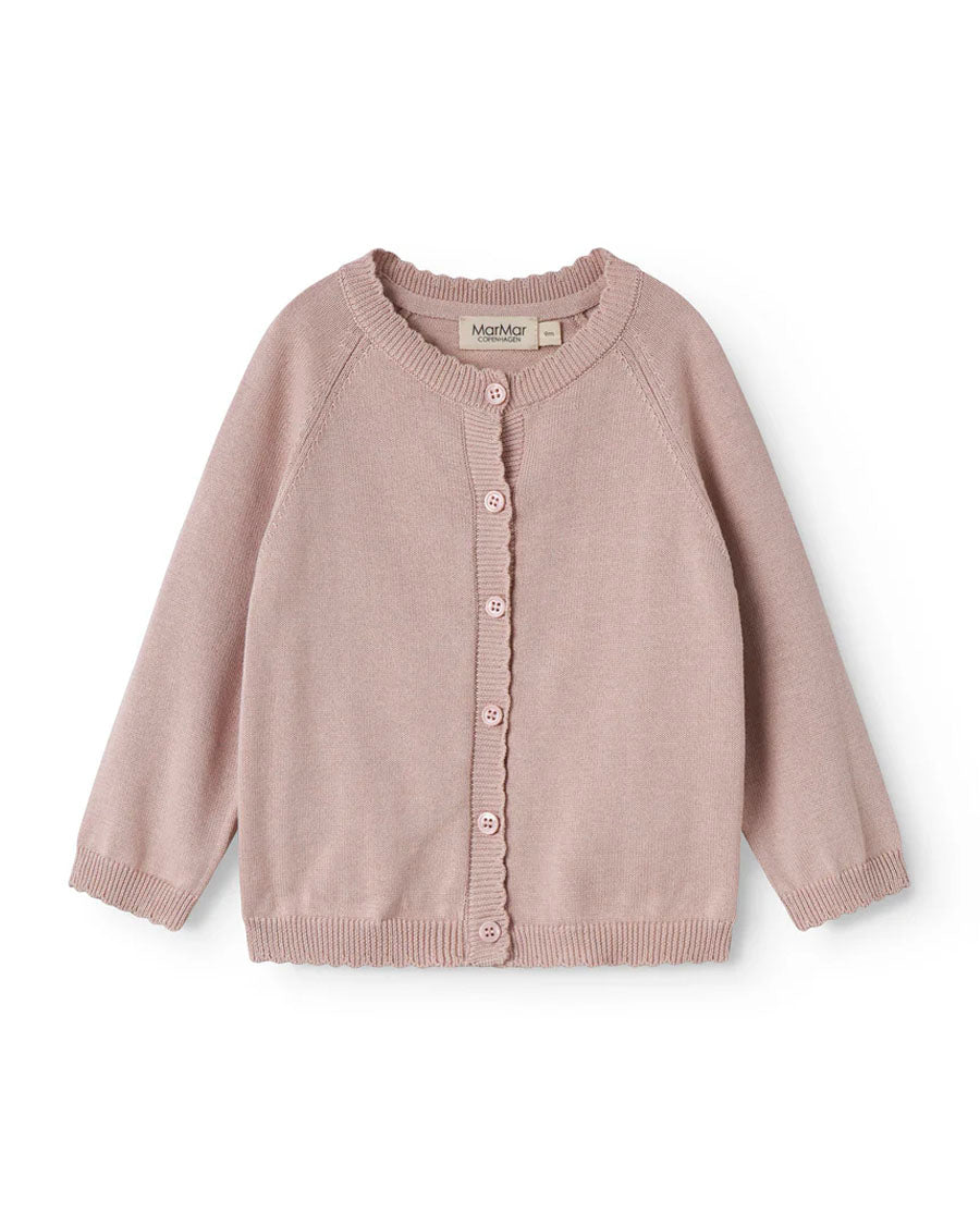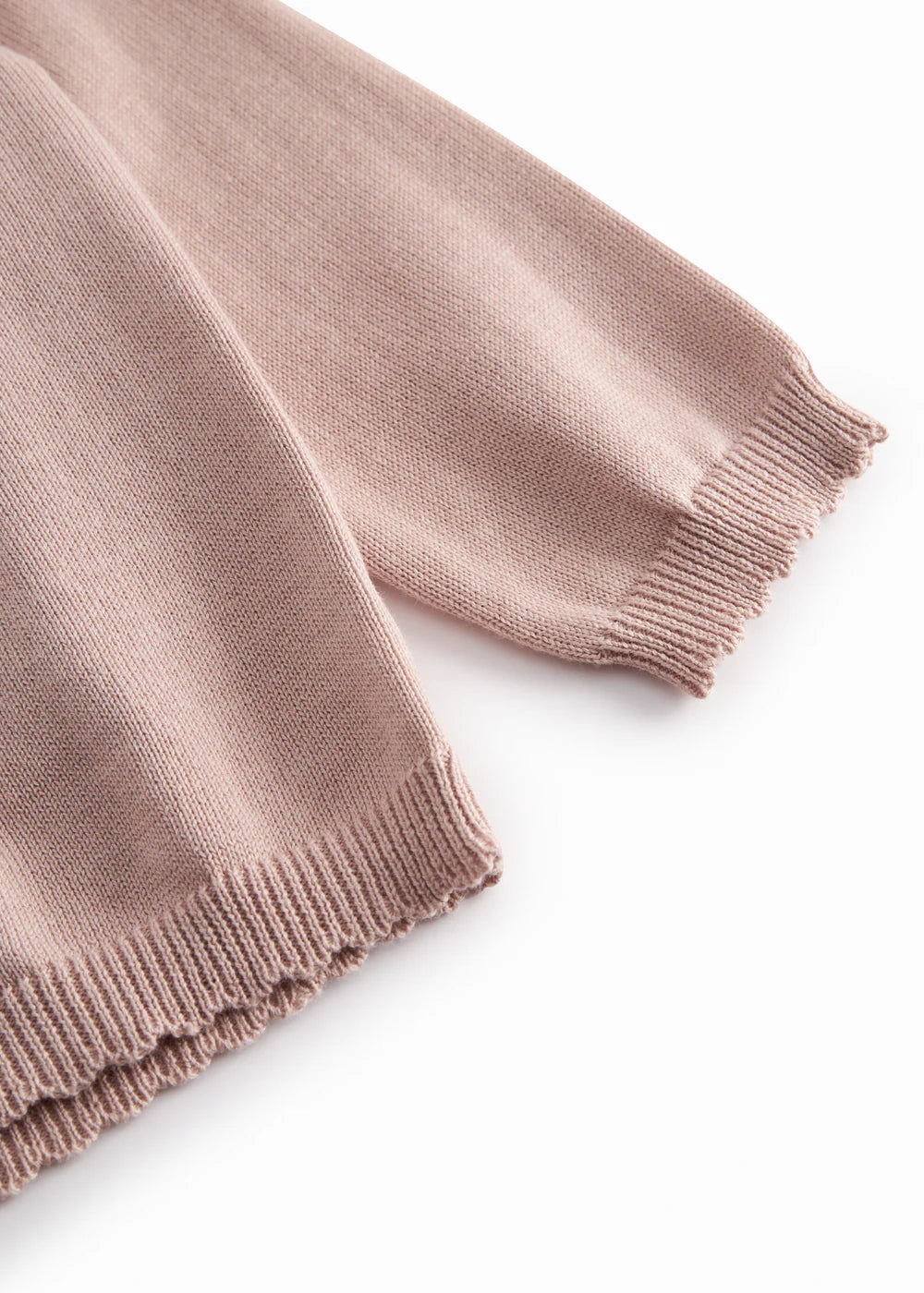 Knit cardigan for the little ones with raglan sleeves, button closure at the front and fine wavy edges. The cardigan is in stockinette stitch and has ribbed edges for a comfortable fit.
