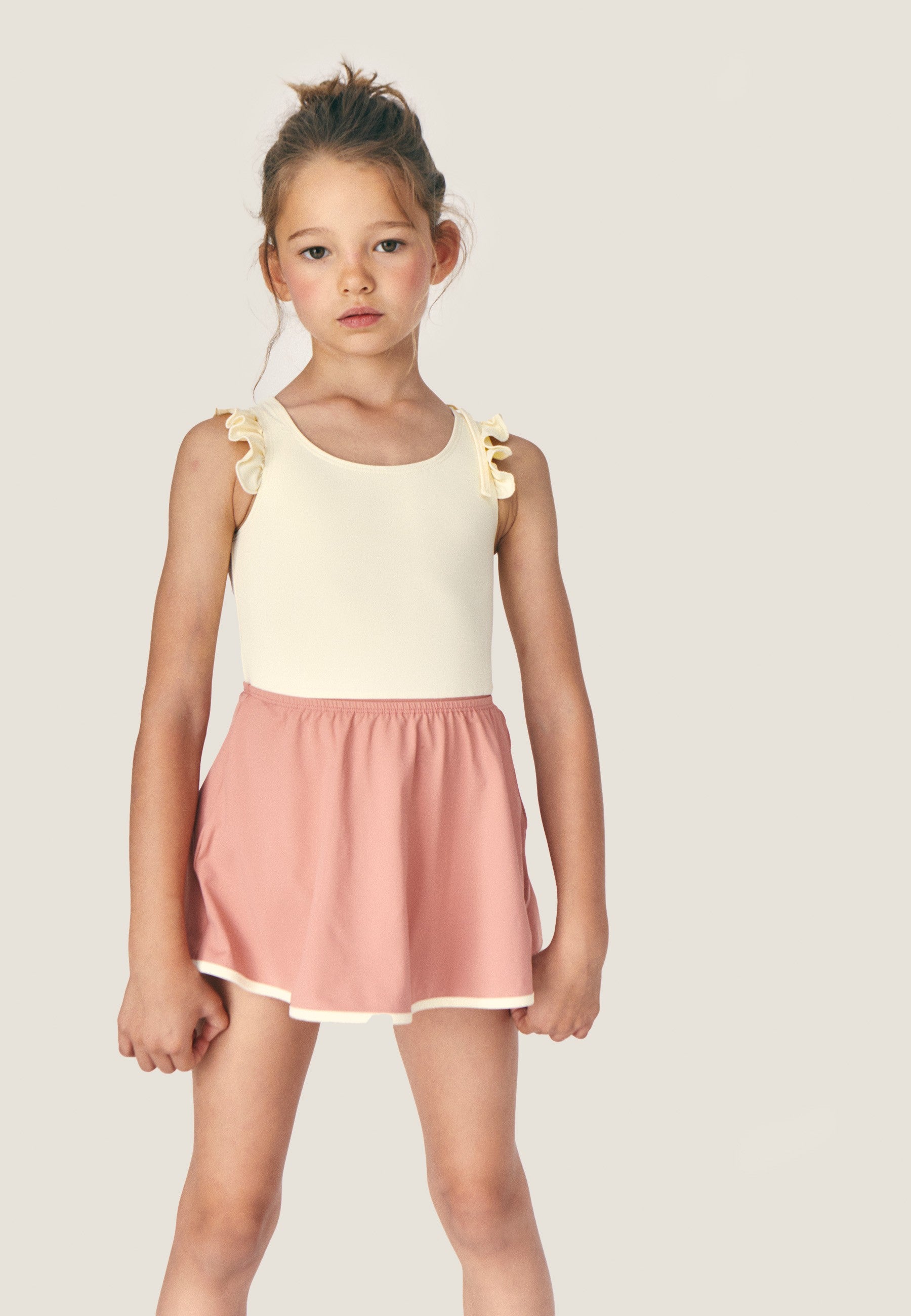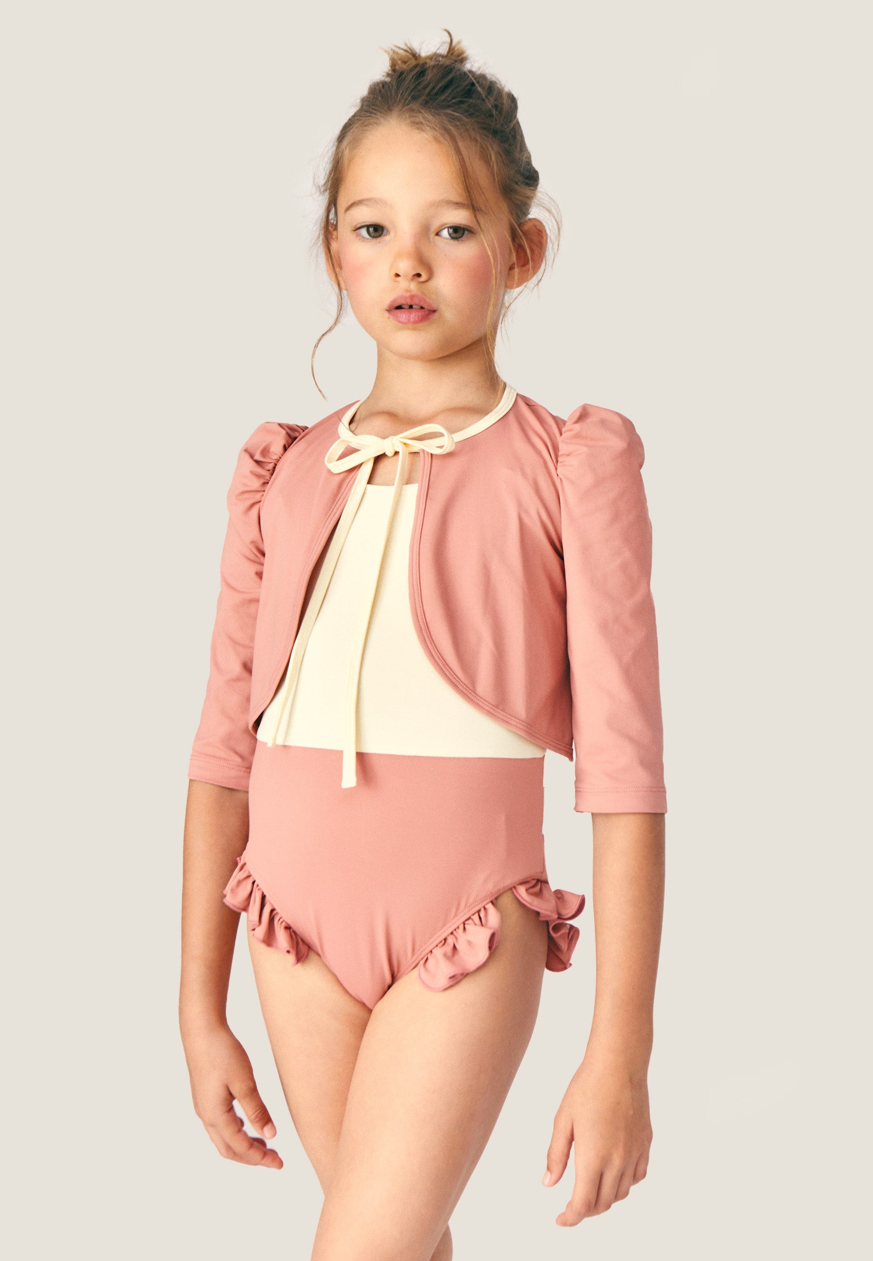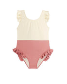 This wear-anywhere one-piece is set to carry them through summer and beyond. The two-tone construction reveals oversized ruffles, bringing movement and drama to every splash.