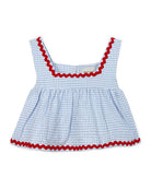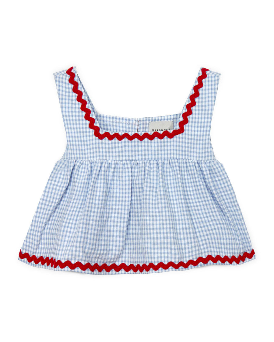 Experiment with soft volumes with the Sylvie top. Stated in a classic gingham, the fit-and-flare design is outlined with a contrasting wavy ribbon trim.