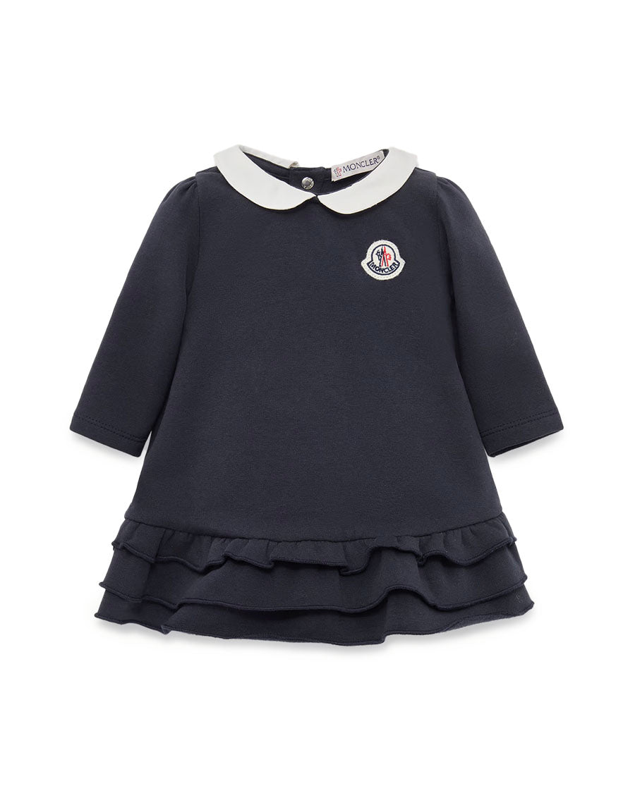 Crafted from stretch cotton fleece, this dress promotes comfort that lasts all day. The soft style is detailed with gathered sleeves and charming ruffles along the skirt. A snap button closure makes dressing easy.