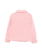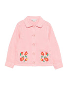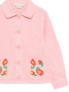 The Stella McCartney Kids pink jacket with floral embroidery for girls is made of 100% cotton, it features pink floral embroidery, a button closure, a pointed collar, and a front patch pocket.