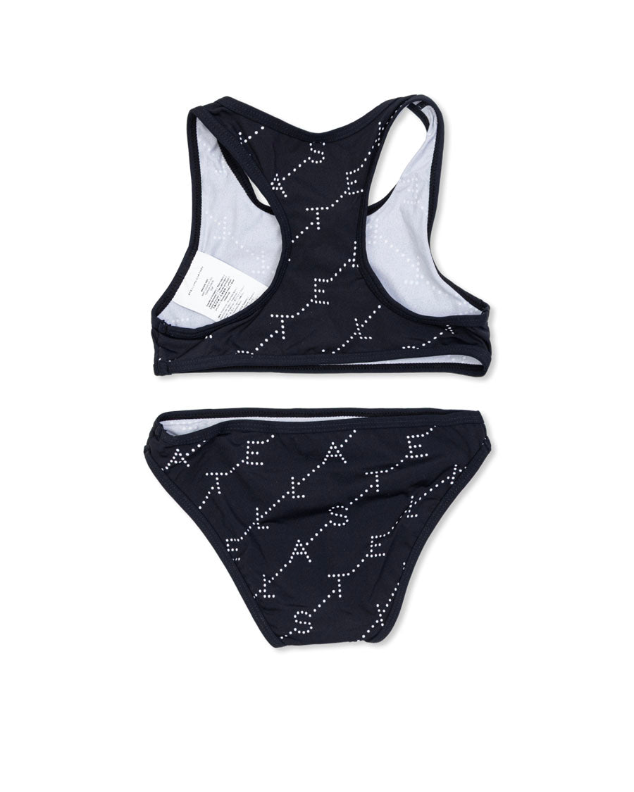 Discover refined summer elegance with this black two-piece bikini from Stella McCartney Kids. This sophisticated swimsuit features a sport-inspired top with broad straps and a classic-cut bottom, exquisitely designed for both style and comfort. The black, subtly ribbed fabric is adorned with immaculate white dots, arranged in a distinctive, geometric motif—a hallmark of contemporary designer collections.