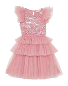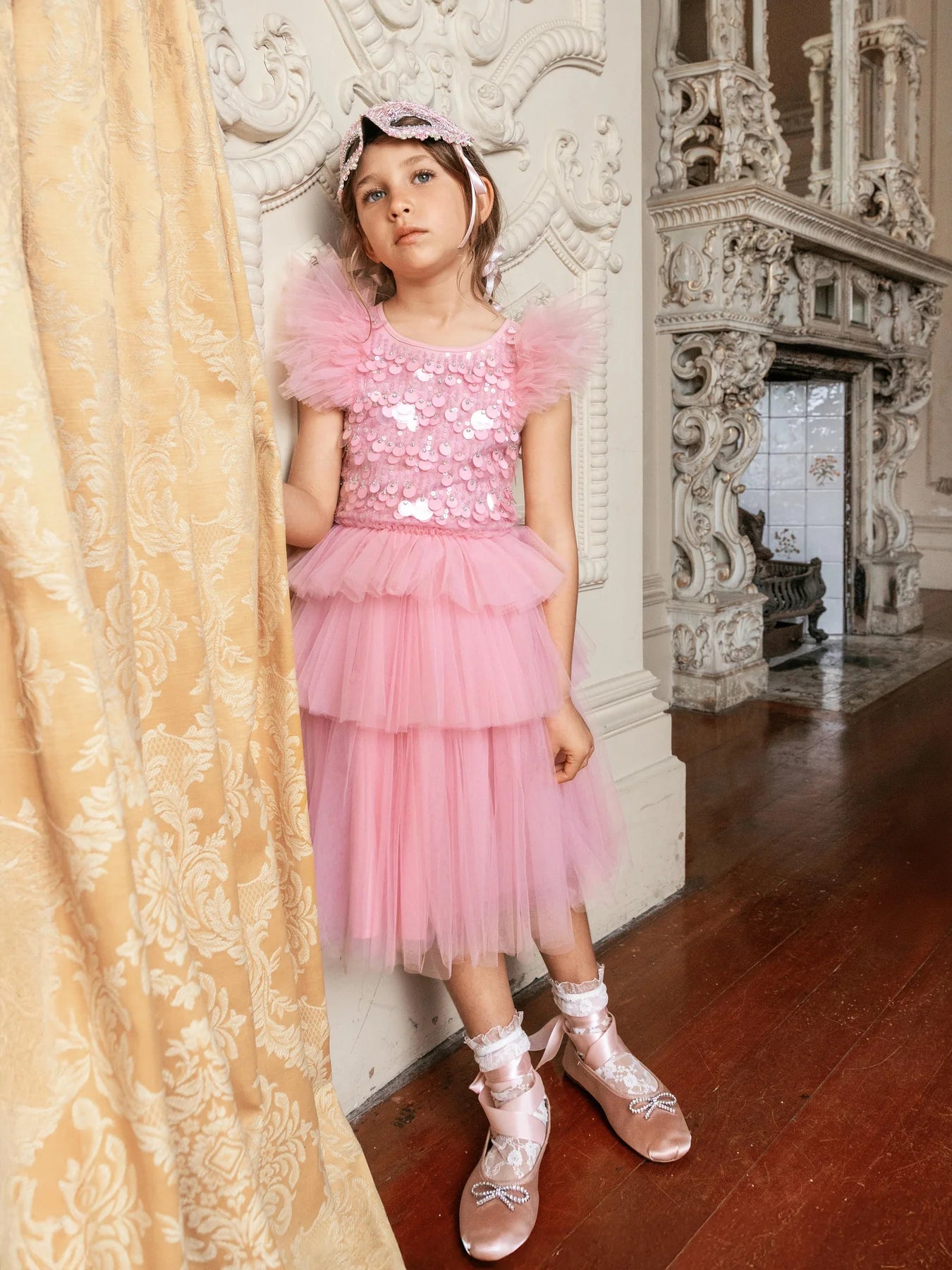 A playful masterpiece, the Daphne Dress in Peach Blush is a celebration of volume and shimmer. Its tiered tulle skirt flows with effortless movement, while oversized ruffle sleeves create a striking, bold silhouette. The bodice is adorned with a dazzling array of sequins and larger sequin discs, catching the light in every direction.