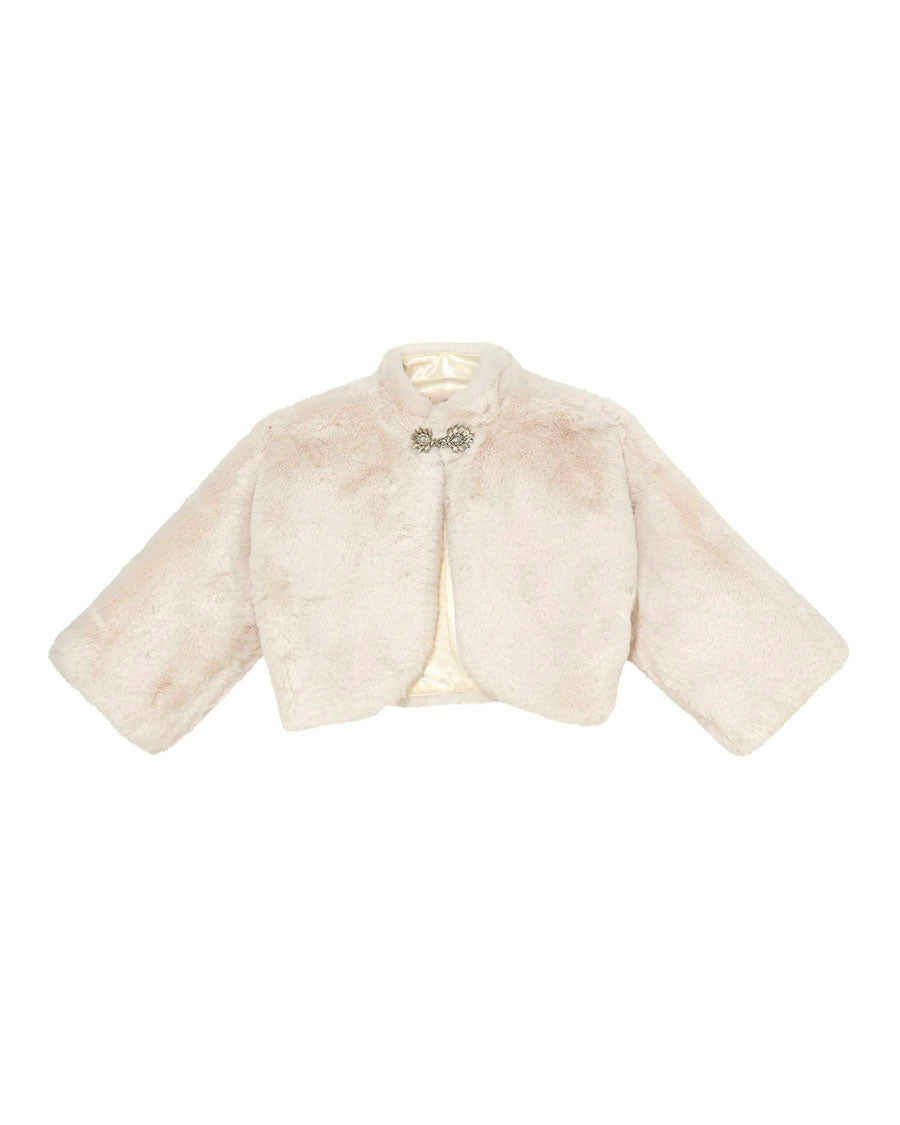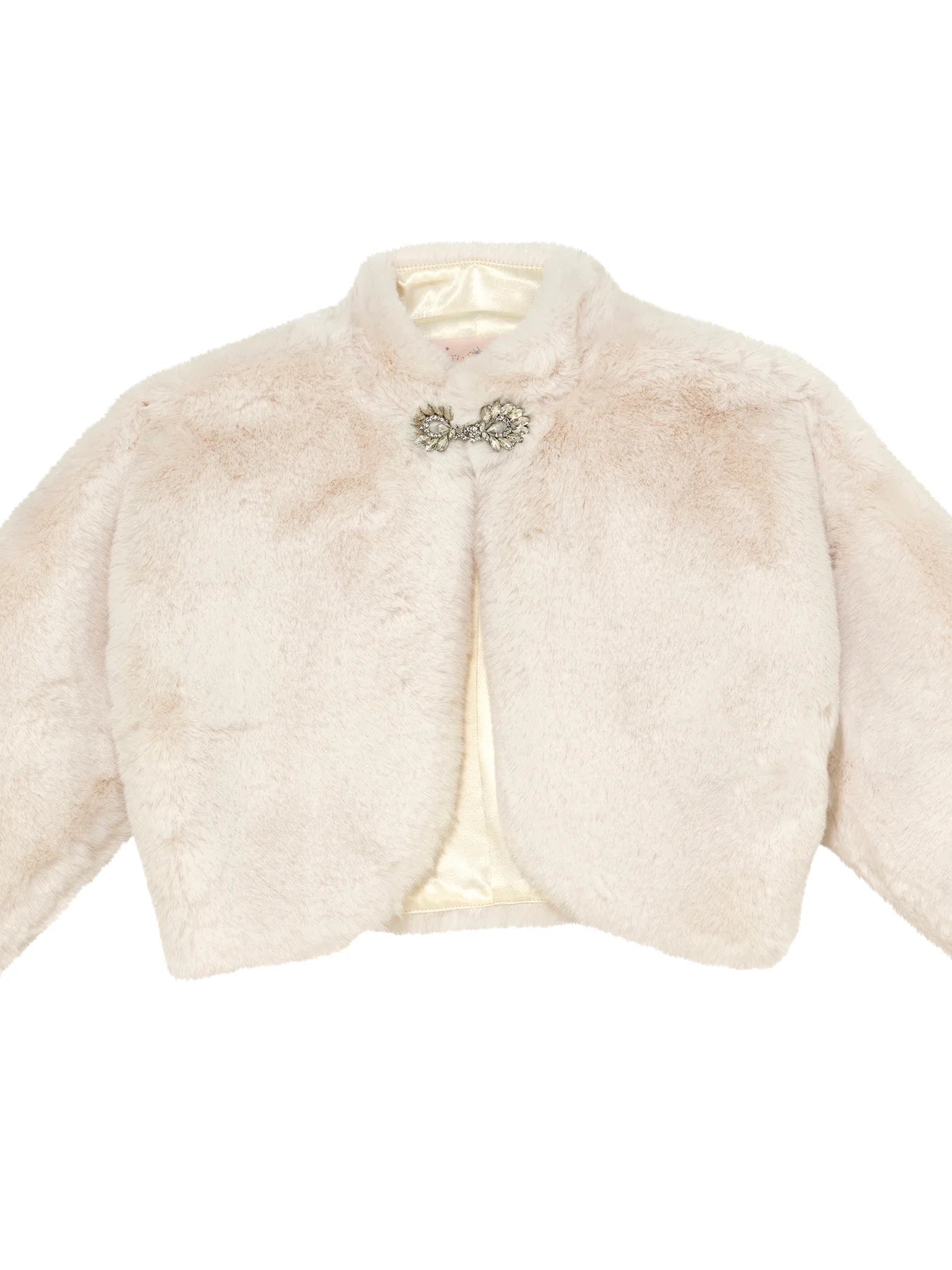 Feel cozy and warm when wearing the lush Promenade Jacket in Milk. Created from faux fur with a curved hem, in the middle sits a crystal embellishment the connects in to a hook-and-eye to close the jacket. Leaving her feel like a royal during the cooler season.