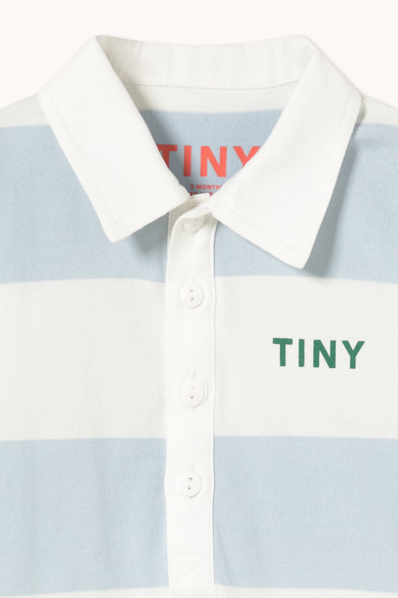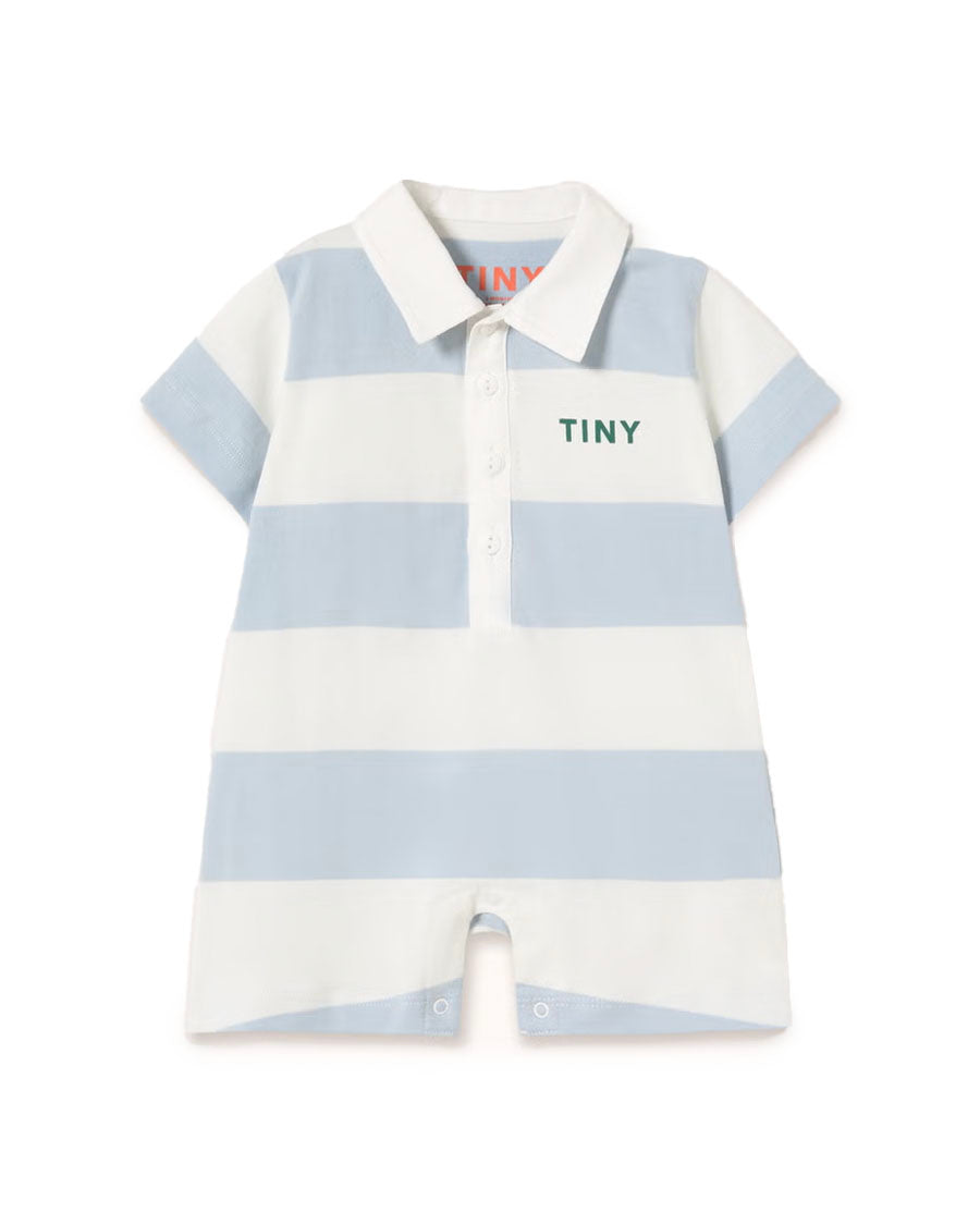 This striped one-piece is crafted from 100% organic cotton with a breathable feel. It features a polo neck, snap buttons at the legs, and a half-front button opening for easy dressing. It's a comfortable, practical piece made for everyday wear.