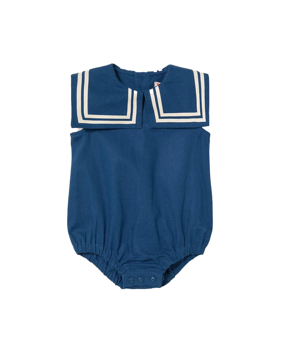 This sailor inspired romper combines comfort, style, and functionality for little ones. Made from a breathable cotton blend, it features an oversized collar with striped details and back buttons for easy dressing. The bottom snap closure allows for quick and convenient diaper changes. Its relaxed, comfortable fit offers full freedom of movement, making it perfect for everyday wear. A practical, stylish, and essential piece for your baby’s wardrobe.