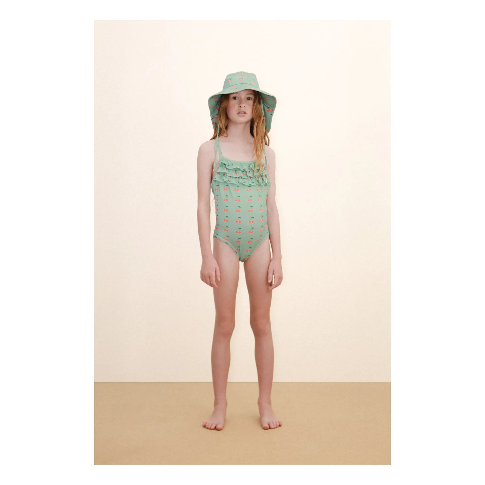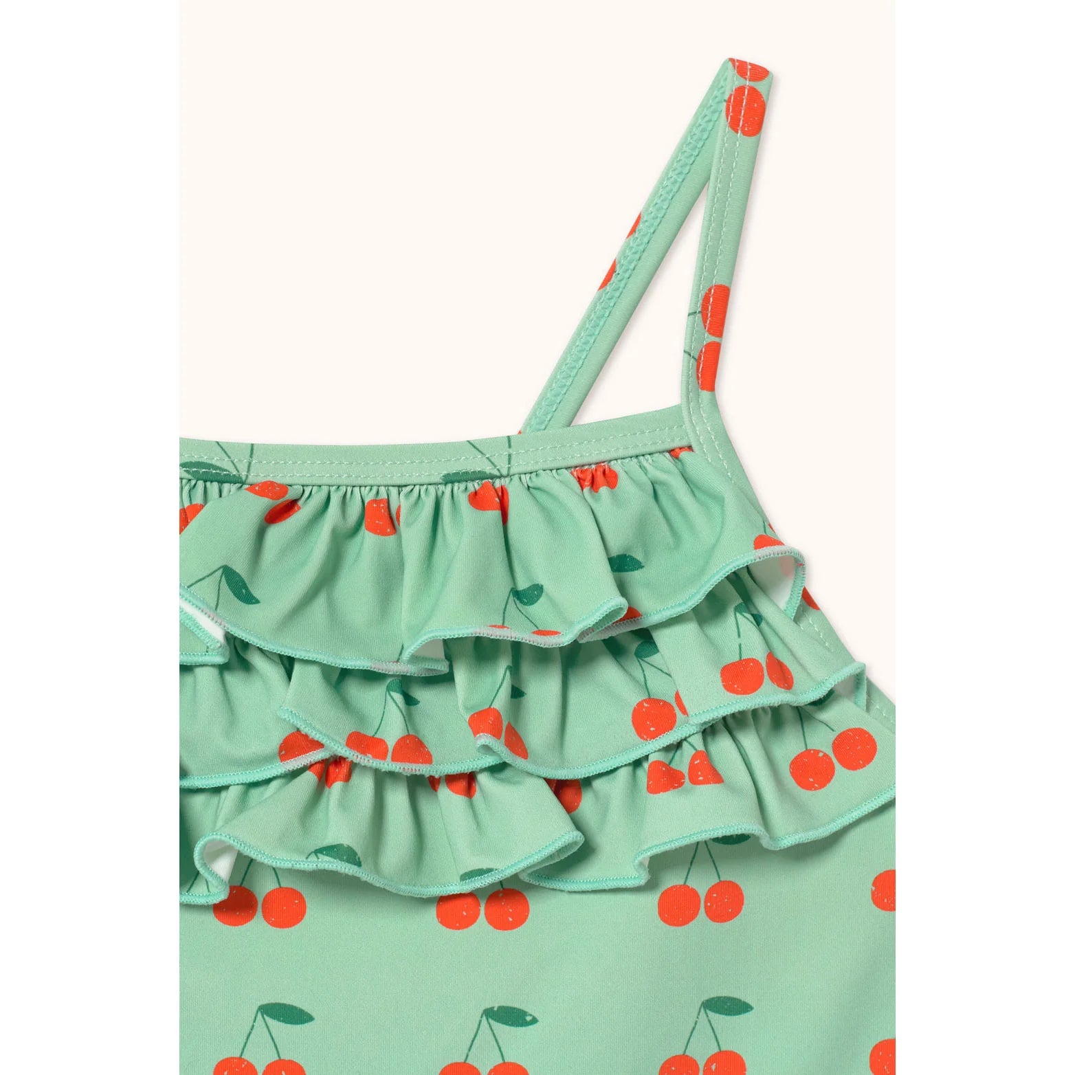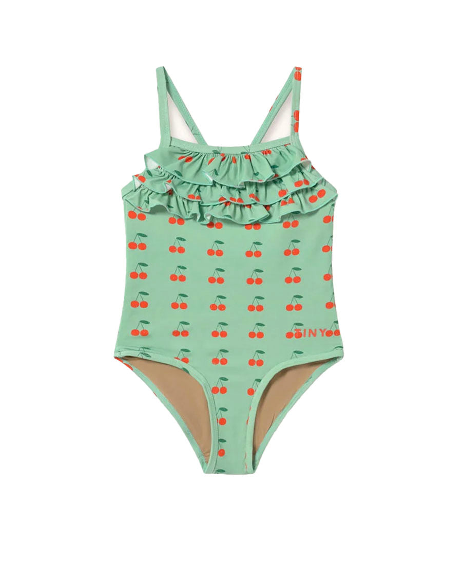 Add a cheerful touch to summer with this strappy swimsuit, crafted from a soft, stretchy fabric for maximum comfort. Featuring our charming Cherries print on an emerald base and delicate ruffles on the front, it perfectly combines style and fun for sunny days.