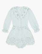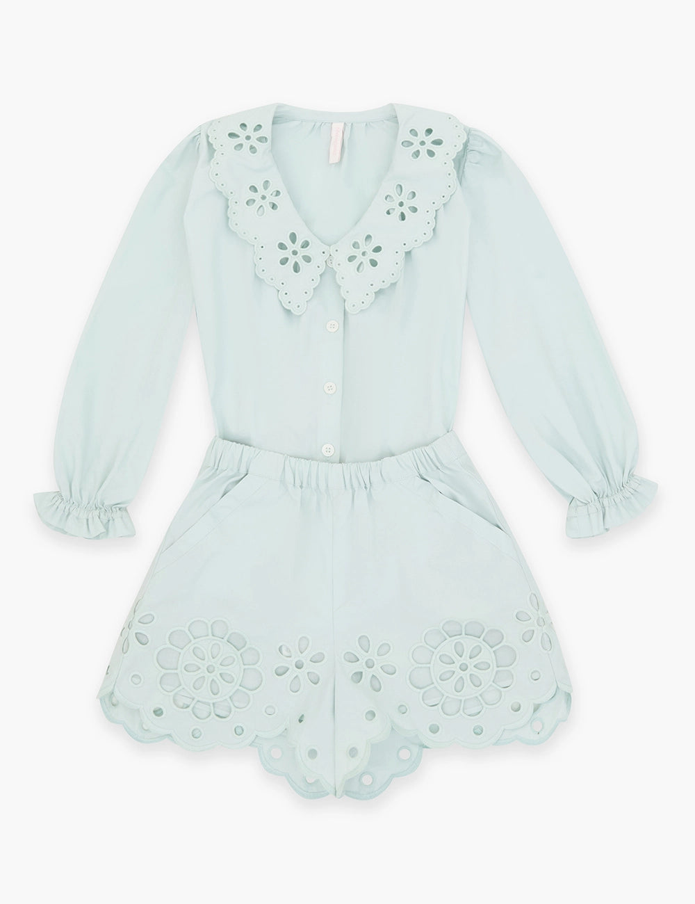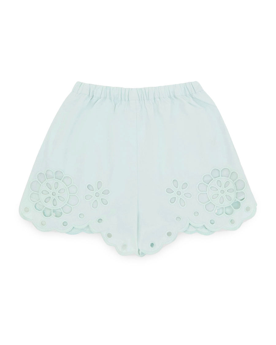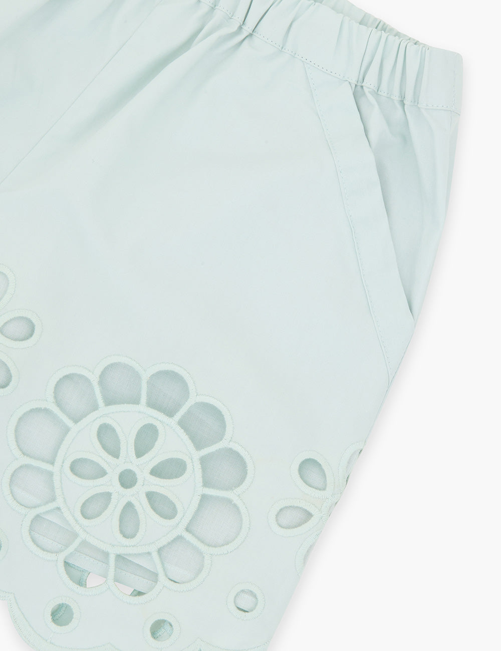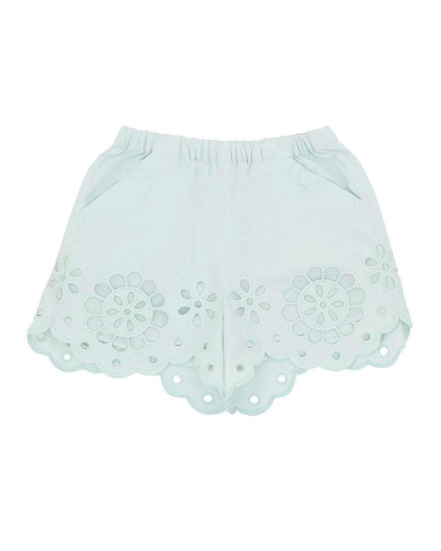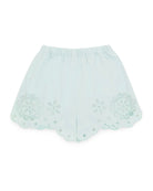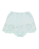 The Awaken Kids Broderie Short in Soft Mint from our Resort Swim 2026 Collection. A kids cotton short featuring an elasticated waist and scalloped hem finish.
