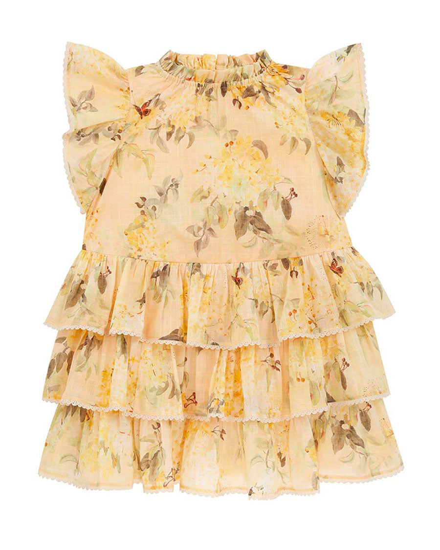 The Cascadian Kids Swing Dress in Yellow Botanical Floral from our Summer Swim 2025 Collection. A cotton dress featuring an elasticated neckline, tiered skirt and scalloped detail hem.