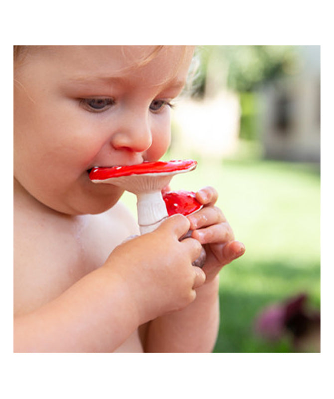 Let's welcome Spot the Mushroom! This mushroom-shaped baby teether will stimulate babies’ senses while soothing little gums. Its realistic textures will develop kids’ sense of touch. Introduce kids into loving the nature that surrounds them! Made by Oli & Carol.