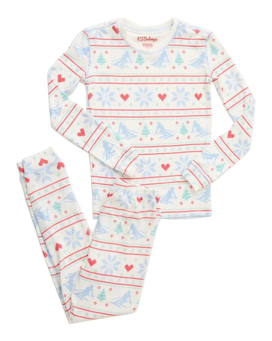 Match your mini and let your little ones embrace the winter spirit with these kids' ivory pajama sets, featuring a playful ski-theme pattern. The long sleeve top and banded pants are crafted from super soft peachy fabric providing warmth and comfort for cozy nights or lounging at home. The adjustable banded waist ensures a cozy snug fit, while the fun design adds a touch of seasonal charm to their bedtime routine.