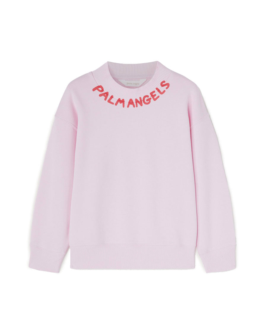 Logo in different touch-and-feel versions. Girl's rose pink crewneck sweatshirt with cherry red screenprinted logo around the neck.