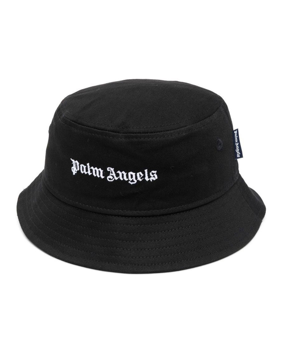 Palm Angels' bucket hat spotlights the brand's gothic logo at the centre. The white letters pop against the black background.
