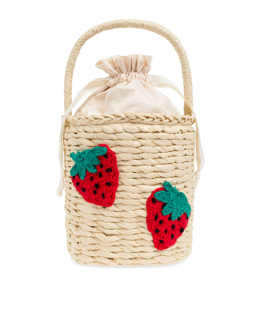 Straw Bucket Bag w/ Strawberry Crochet Patches