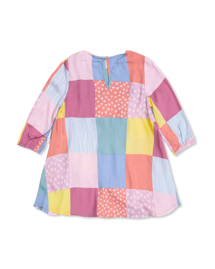 Classically flared dress with long sleeves and a round neckline. The dress captivates with a joyful multicolored patchwork of artfully arranged squares, while the front displays an enchanting, intricately embroidered animal motif.