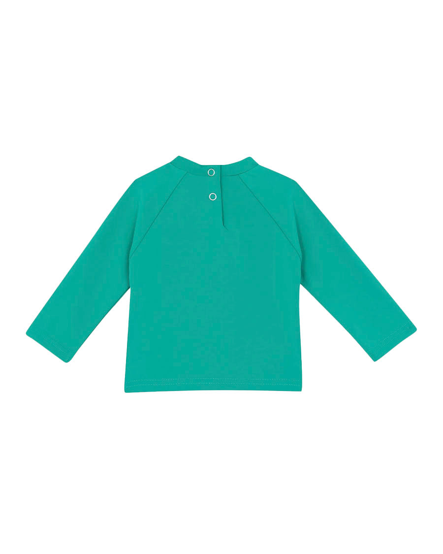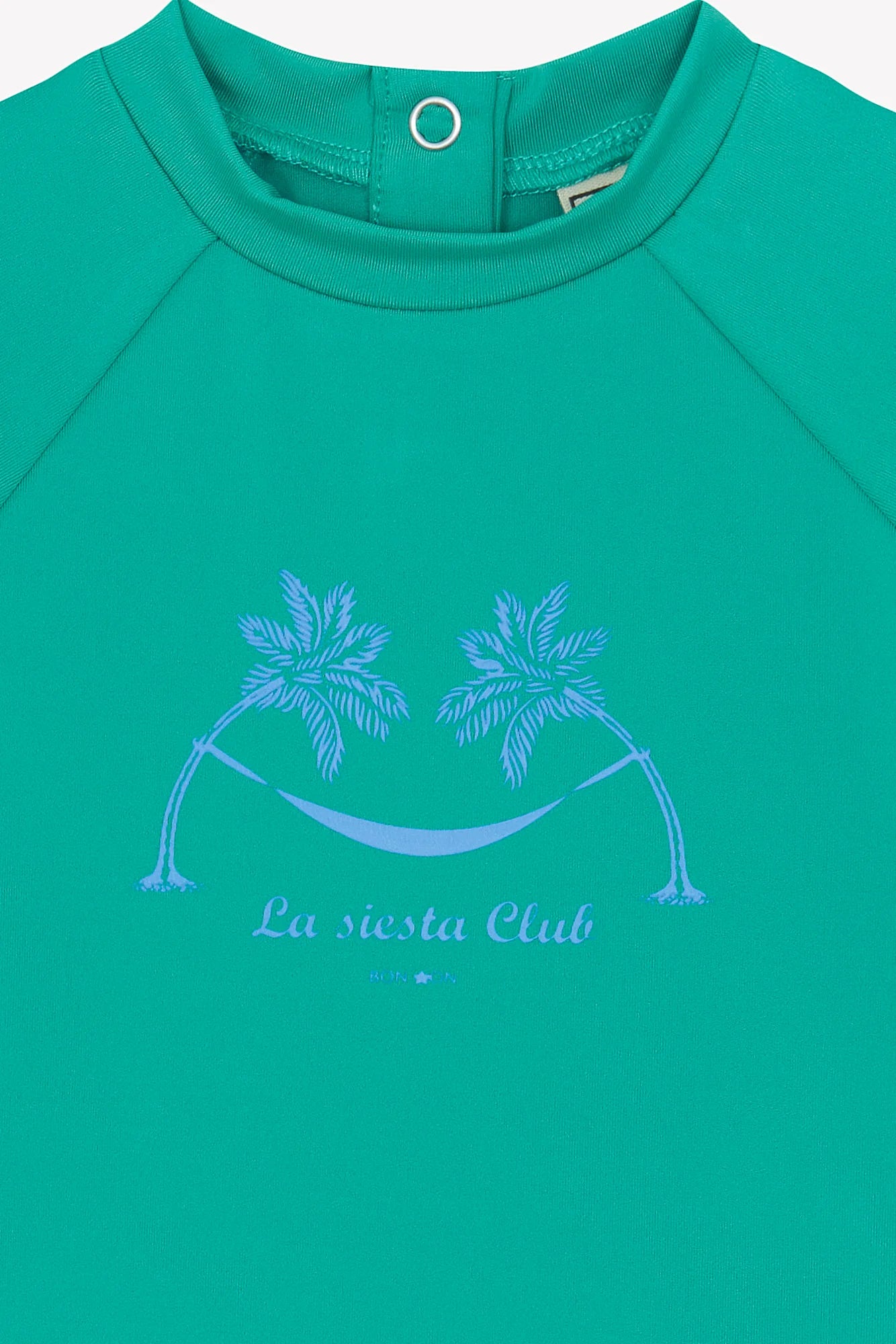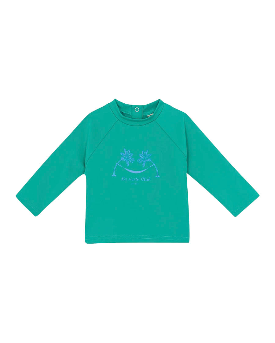 Long-sleeved swim t-shirt Green paradise invites you to a relaxing break at “La siesta club”! Equipped with anti-UV protection, it protects our little adventurers under the sun. Perfect for playing on the beach or taking a nap in the shade. To be combined with a Short swimwear for a fun and stylish summer look!